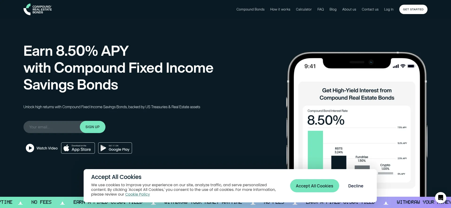 Looking to compound your savings? With Compound Banc, you can earn 8.50% APY on your savings. Start investing in real estate-backed bonds for as low as $10.