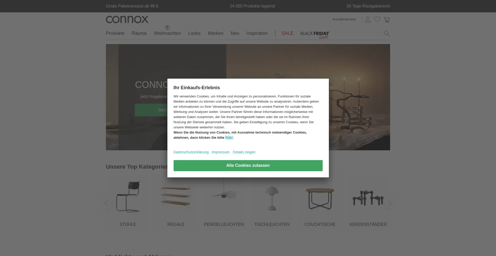 Analysis indicates that connox.de operates as an e-commerce platform facilitating online transactions for goods or services. The website implements shopping cart functionality, payment processing systems, and product catalog features typical of commercial retail operations.
