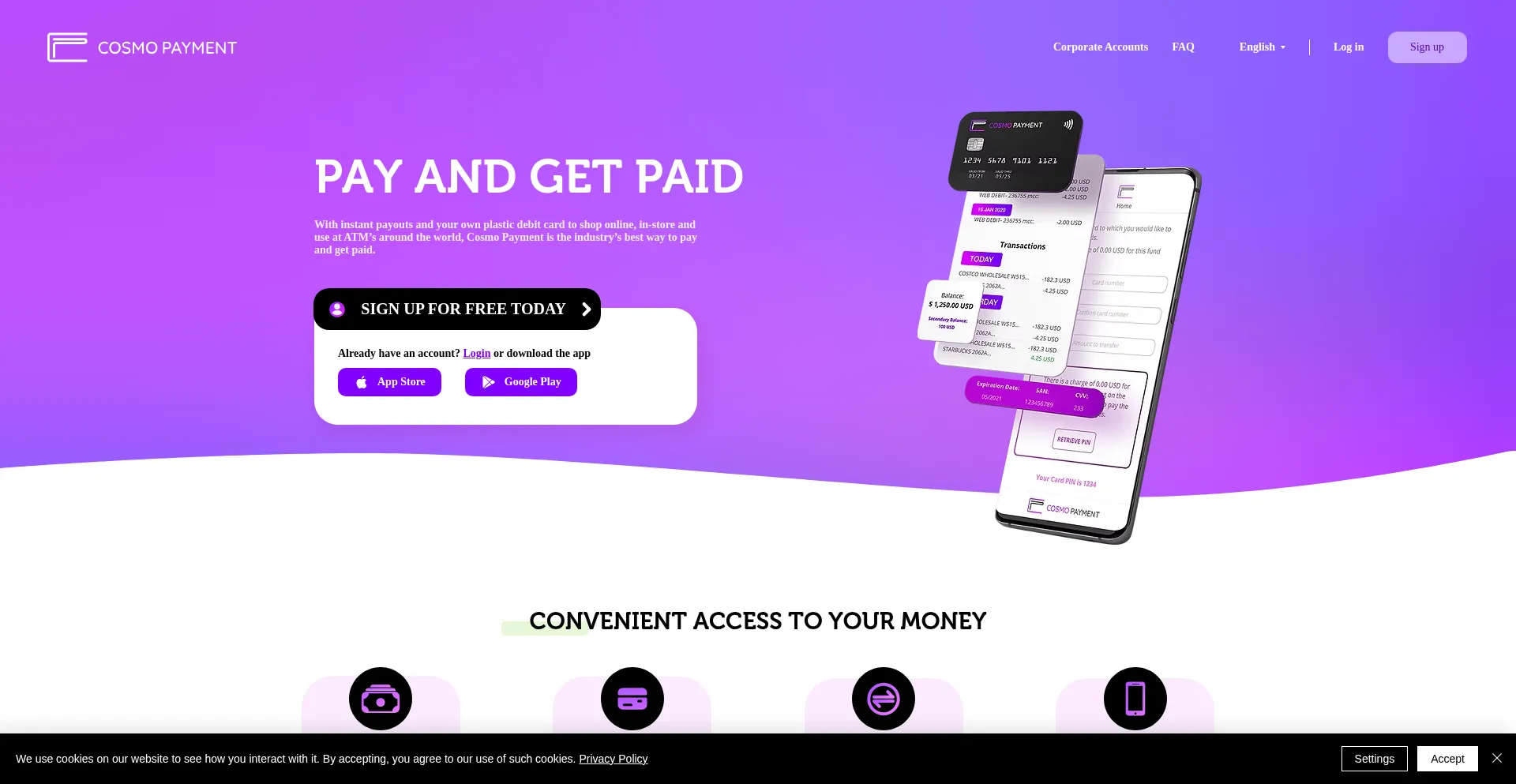 Enjoy instant payouts and your own plastic debit card for shopping and ATM withdrawals around the world with Cosmo Payment.