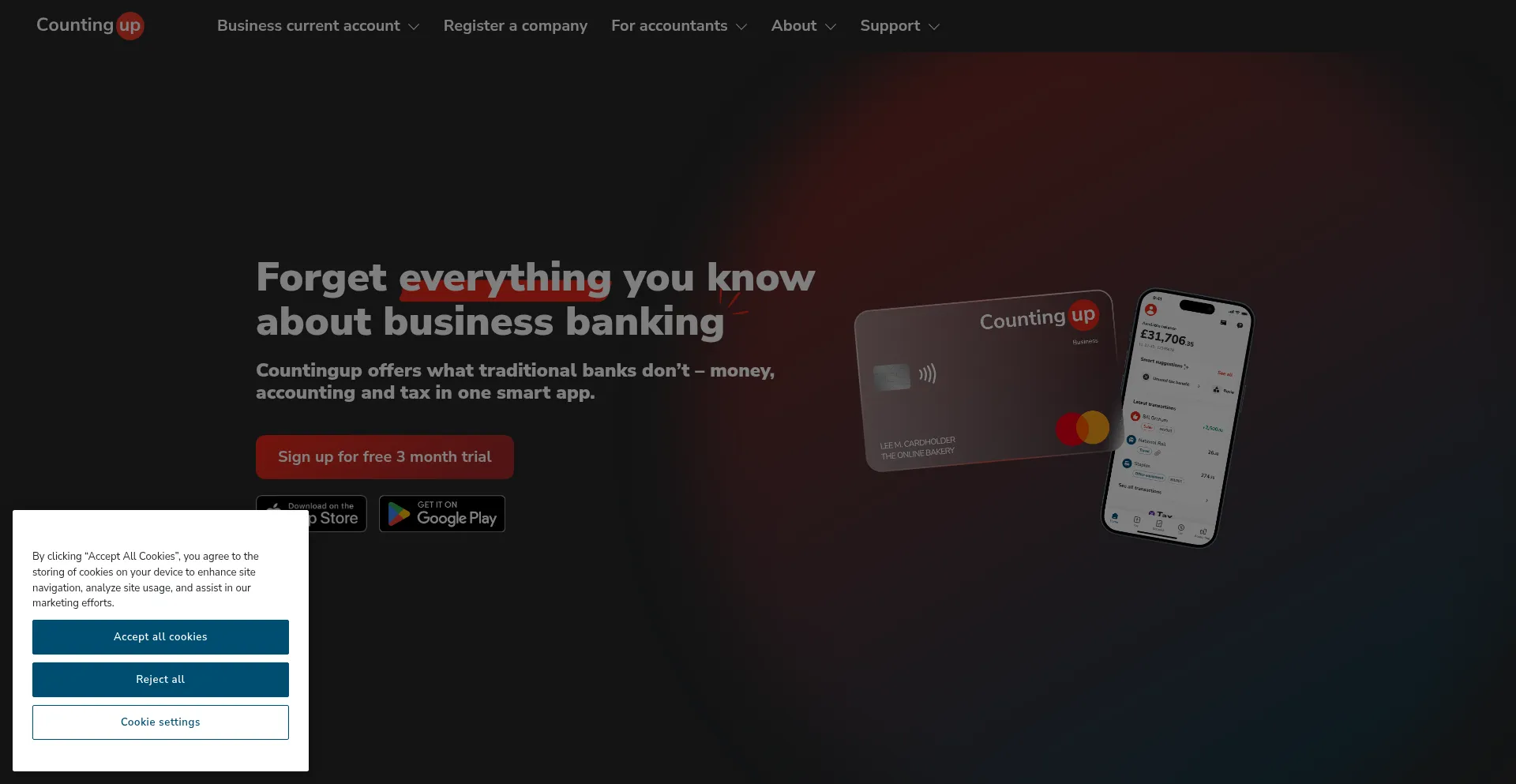 The website implements cookie consent mechanisms in compliance with privacy regulations such as GDPR or CCPA. This demonstrates that countingup.com adheres to data protection standards and provides users with control over personal data collection practices.