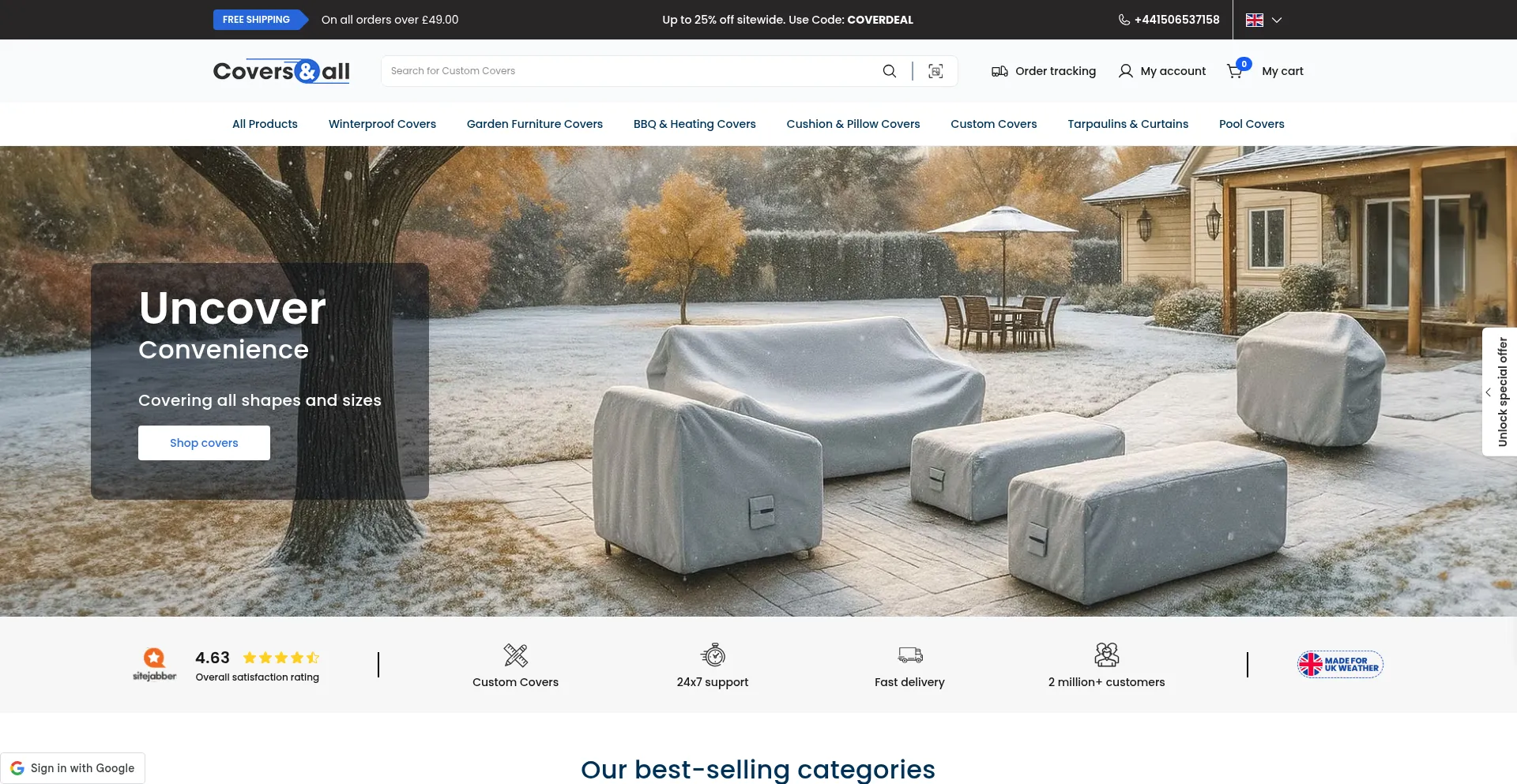 Analysis indicates that coversandall.co.uk operates as an e-commerce platform facilitating online transactions for goods or services. The website implements shopping cart functionality, payment processing systems, and product catalog features typical of commercial retail operations.