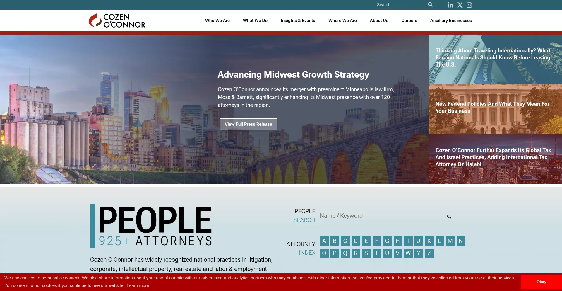 The website implements cookie consent mechanisms in compliance with privacy regulations such as GDPR or CCPA. This demonstrates that cozen.com adheres to data protection standards and provides users with control over personal data collection practices.