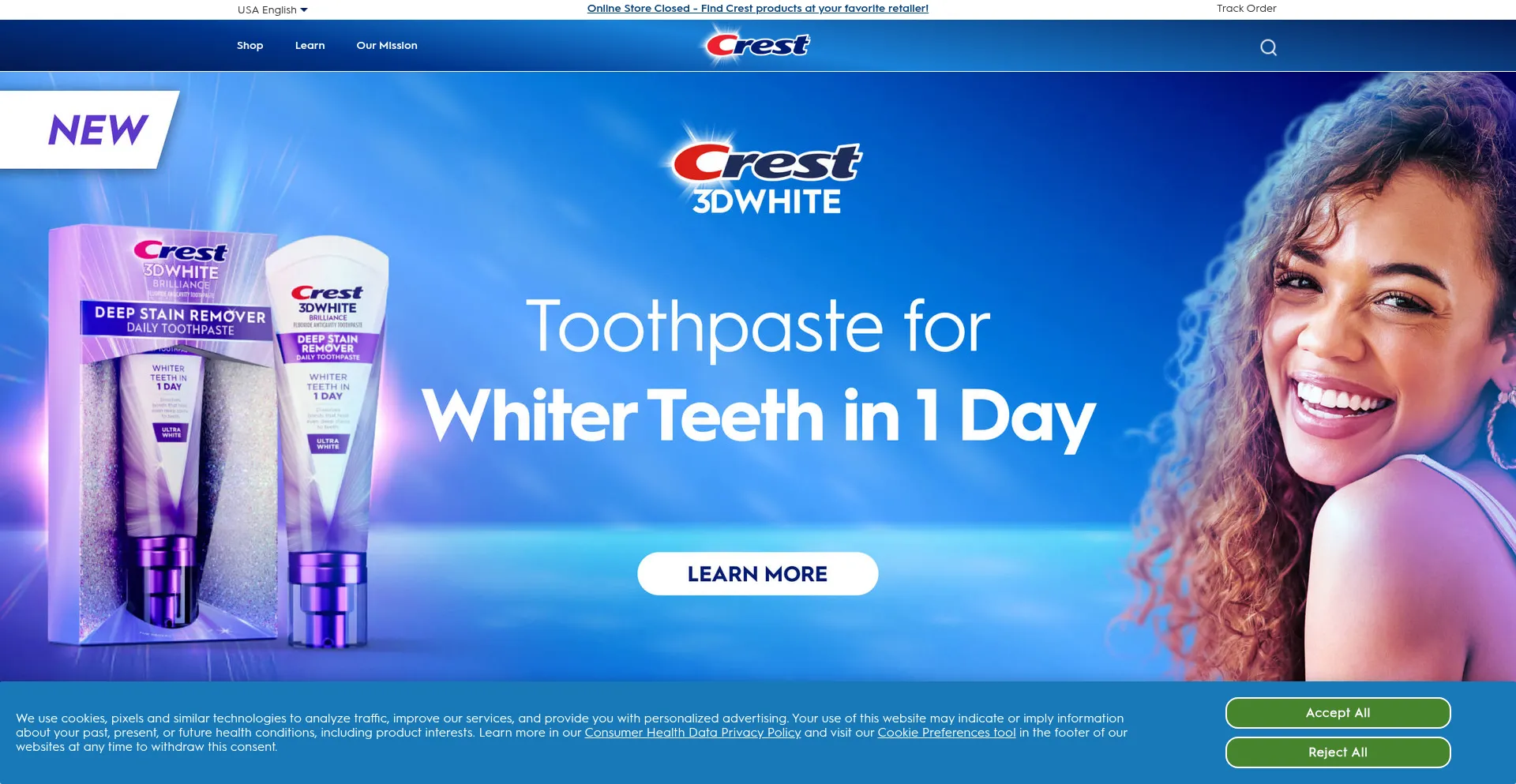 The website implements cookie consent mechanisms in compliance with privacy regulations such as GDPR or CCPA. This demonstrates that crest.com adheres to data protection standards and provides users with control over personal data collection practices.