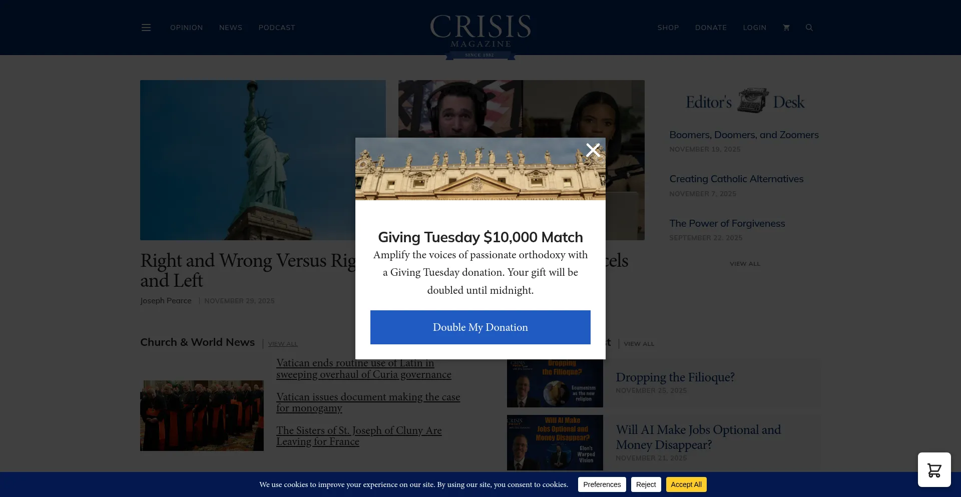 Crisis remains America’s most trusted source for authentic Catholic perspectives on Church and State, arts and culture, science and faith. We have one purpose, and one only: t...