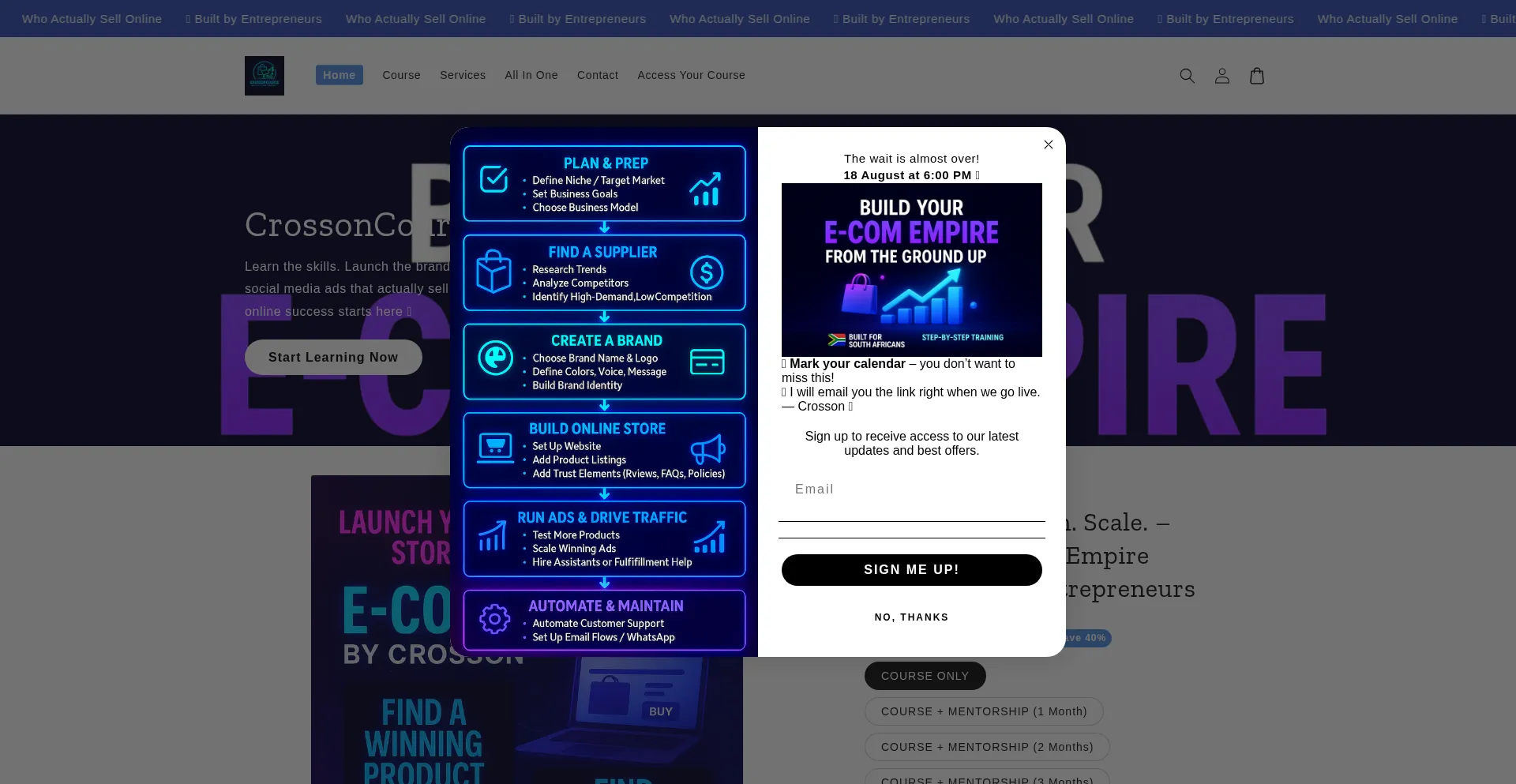 Analysis indicates that crossoncourse.co.za operates as an e-commerce platform facilitating online transactions for goods or services. The website implements shopping cart functionality, payment processing systems, and product catalog features typical of commercial retail operations.