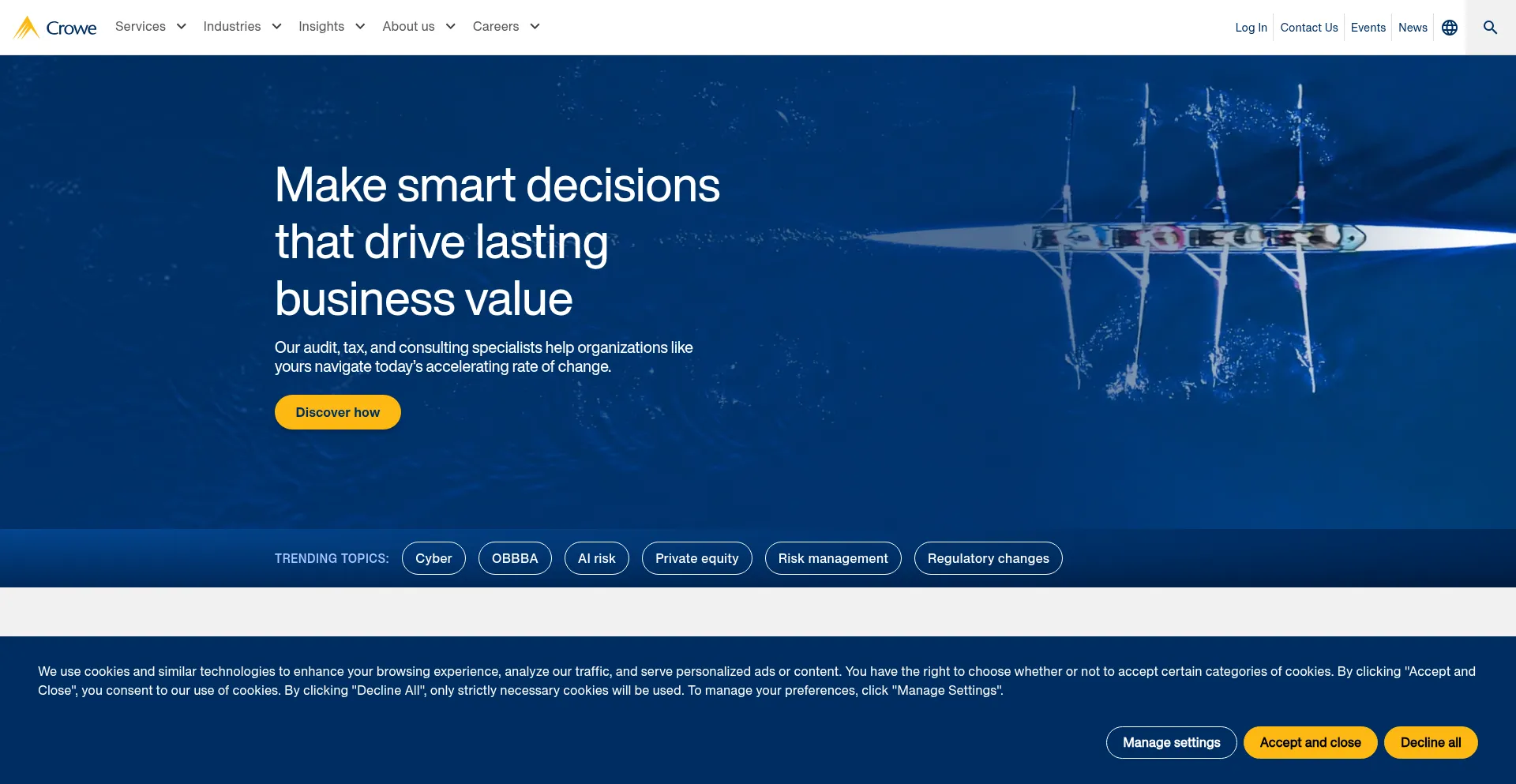 The website implements cookie consent mechanisms in compliance with privacy regulations such as GDPR or CCPA. This demonstrates that crowe.com adheres to data protection standards and provides users with control over personal data collection practices.