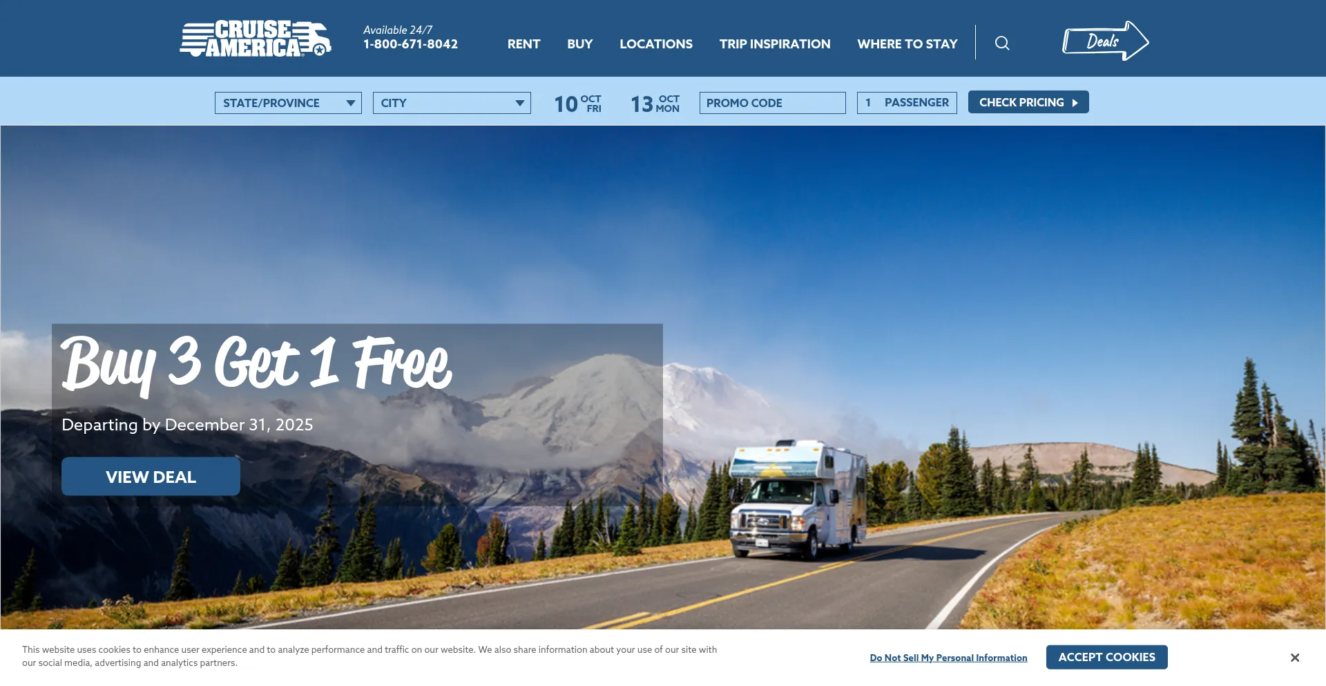 The website implements cookie consent mechanisms in compliance with privacy regulations such as GDPR or CCPA. This demonstrates that cruiseamerica.com adheres to data protection standards and provides users with control over personal data collection practices.
