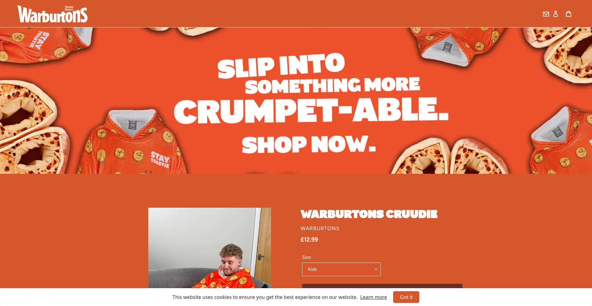 Analysis indicates that crumpetslippers.warburtons.co.uk operates as an e-commerce platform facilitating online transactions for goods or services. The website implements shopping cart functionality, payment processing systems, and product catalog features typical of commercial retail operations.