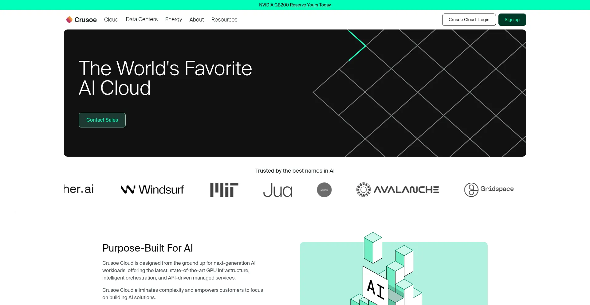 Crusoe provides next-gen AI infrastructure and cloud compute using an energy-first approach. Deploy AI workloads at scale with reliable performance and 24/7 support.
