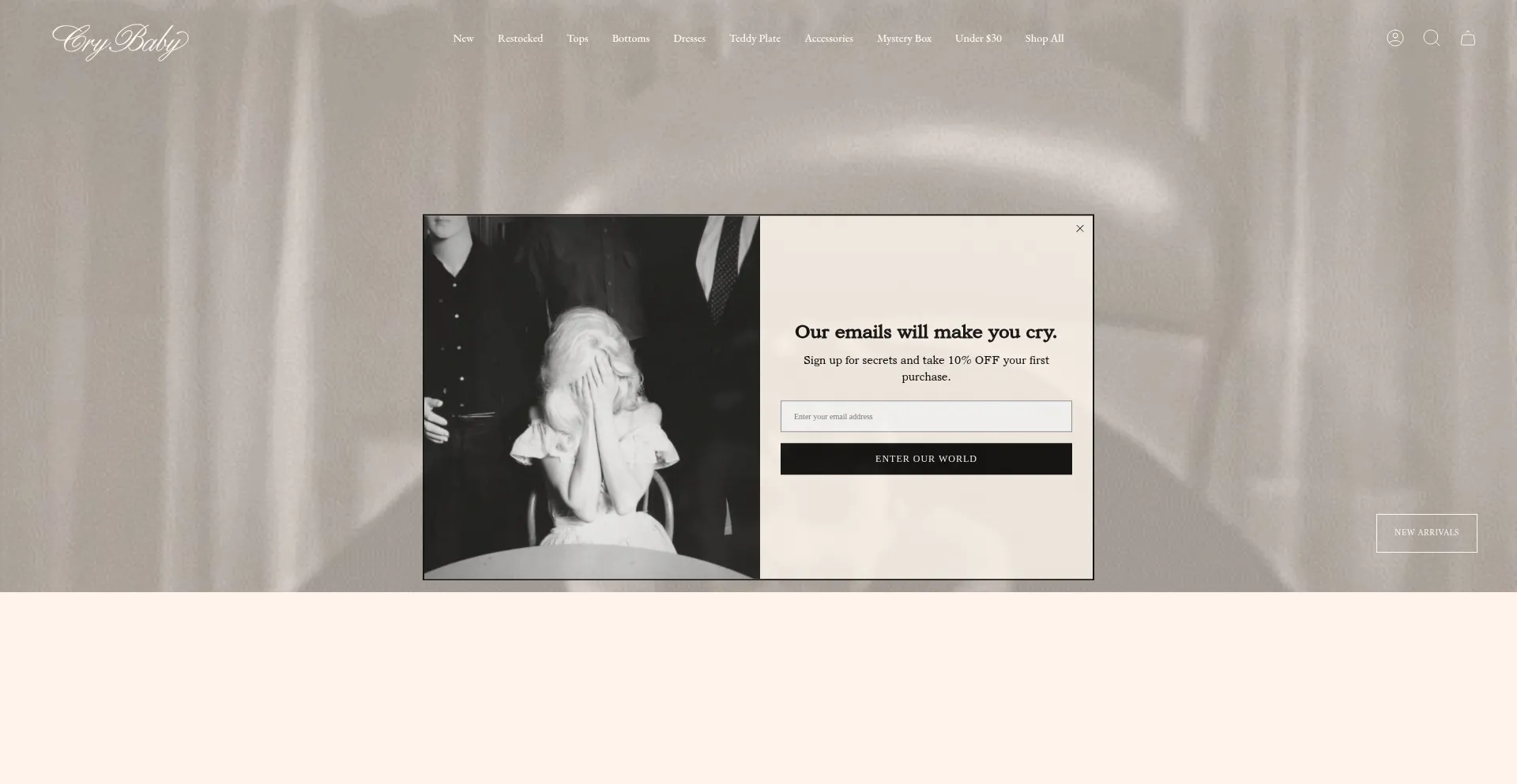 Analysis indicates that crybaby.com operates as an e-commerce platform facilitating online transactions for goods or services. The website implements shopping cart functionality, payment processing systems, and product catalog features typical of commercial retail operations.