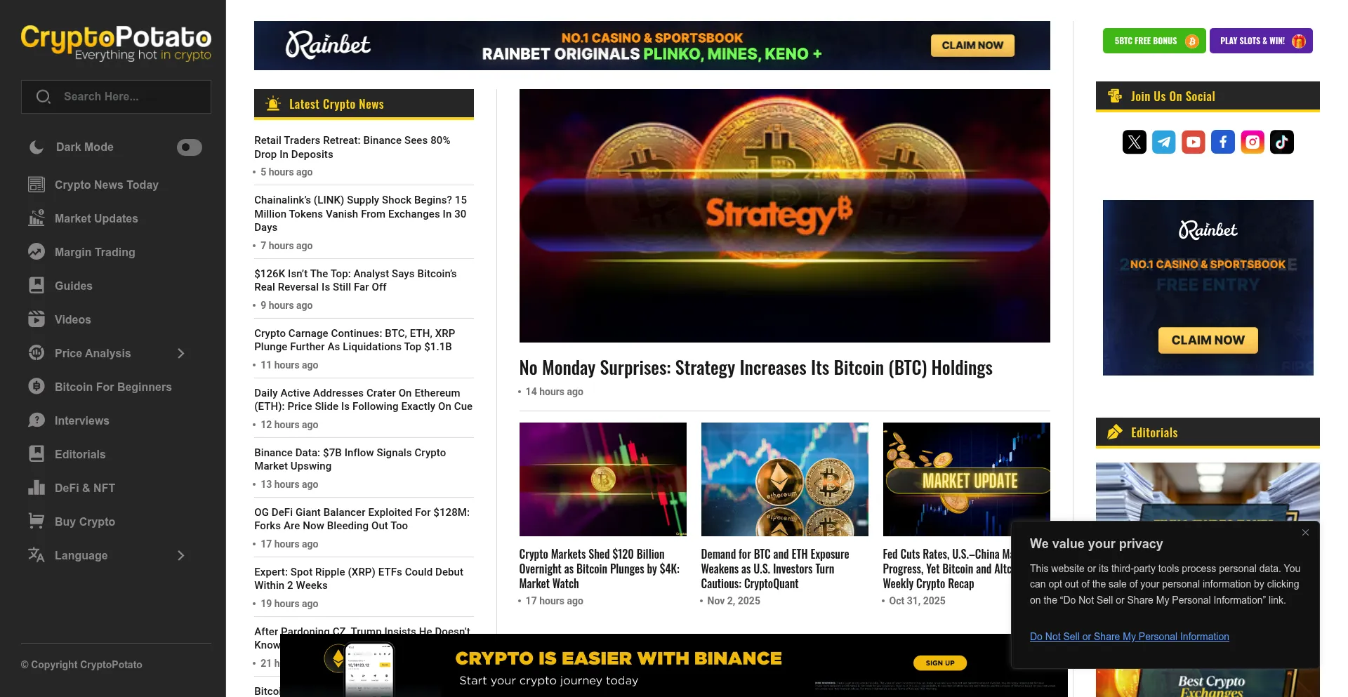 The website implements cookie consent mechanisms in compliance with privacy regulations such as GDPR or CCPA. This demonstrates that cryptopotato.com adheres to data protection standards and provides users with control over personal data collection practices.
