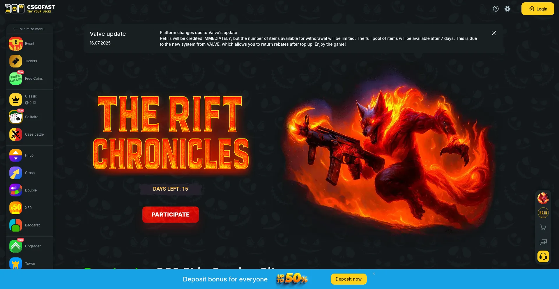 🎲Join CSGOFast, a trusted CSGO skin gaming site since 2015! Offering unique game modes, secure deposits, fast payouts, and fair play!🔒 Play now!