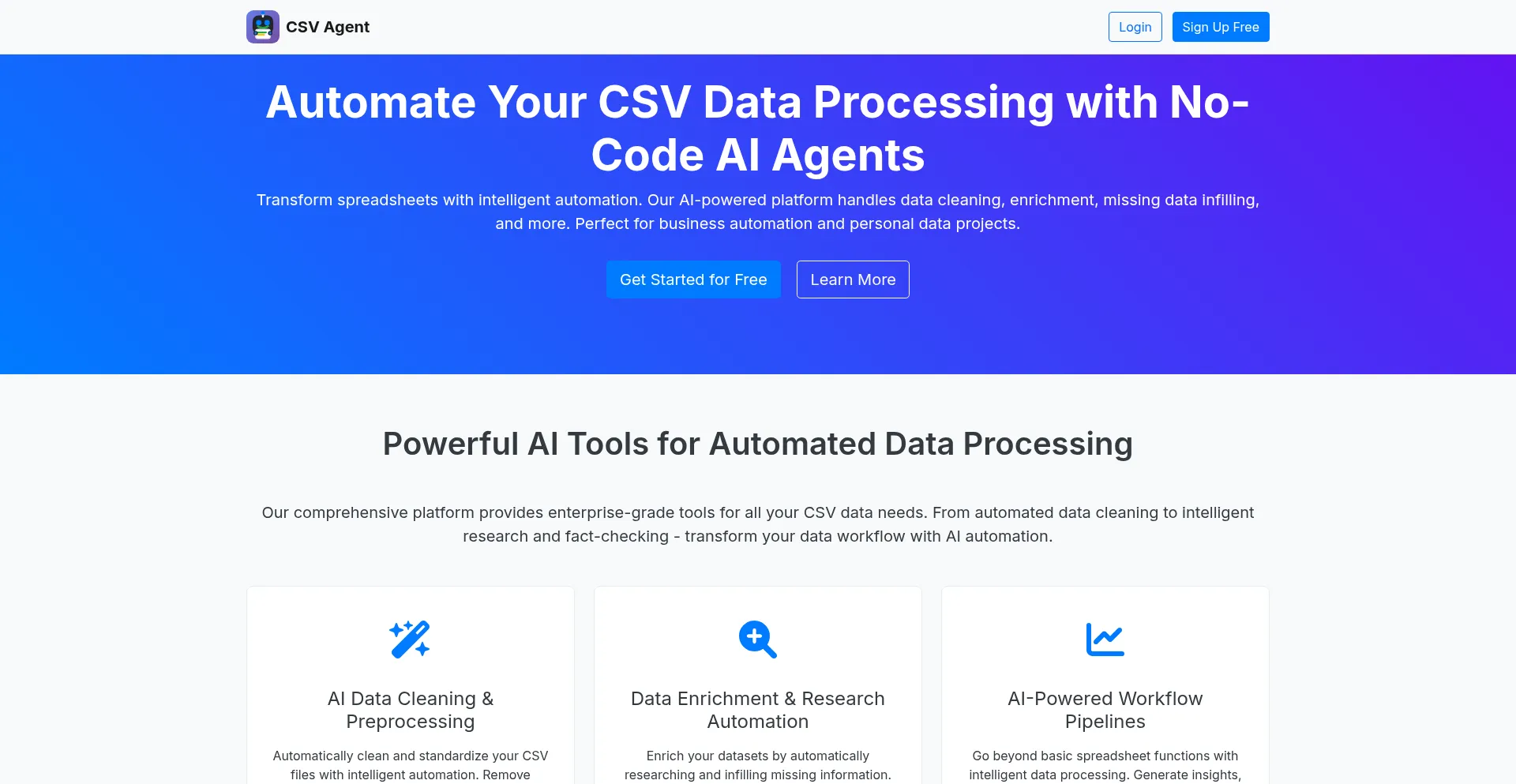 Transform your CSV data with AI-powered automation. Upload CSV files and let intelligent agents handle data cleaning, enrichment, missing data infilling, and automated standardi...