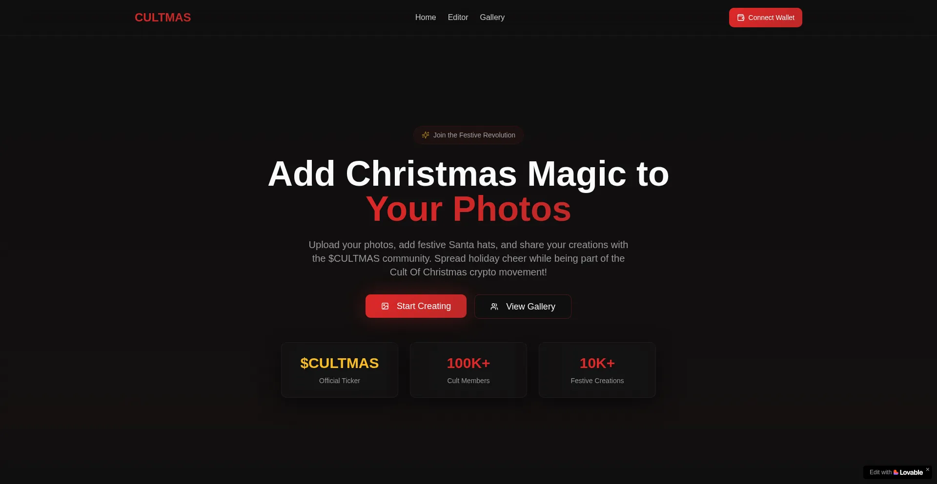 Join the Cult Of Christmas! Upload photos, add Santa hats, and share with the $CULTMAS community. Spread holiday cheer with crypto-powered creativity.