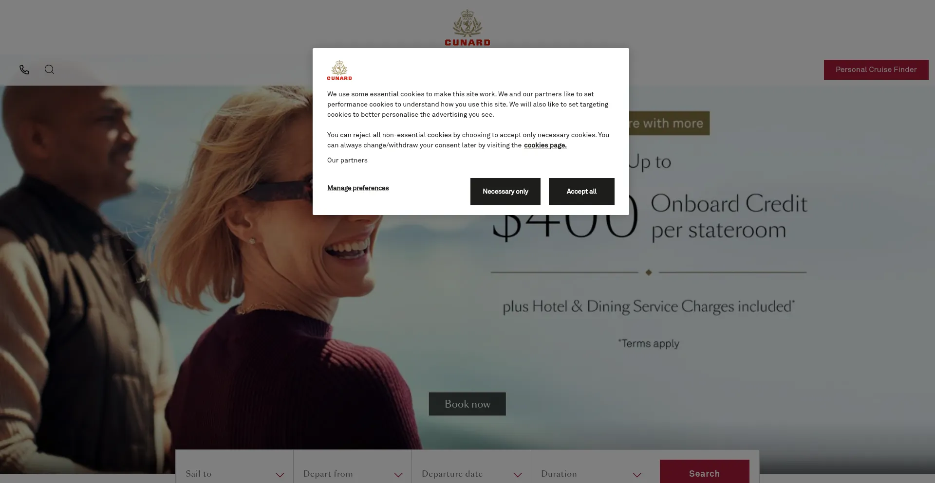 The website implements cookie consent mechanisms in compliance with privacy regulations such as GDPR or CCPA. This demonstrates that cunard.com adheres to data protection standards and provides users with control over personal data collection practices.