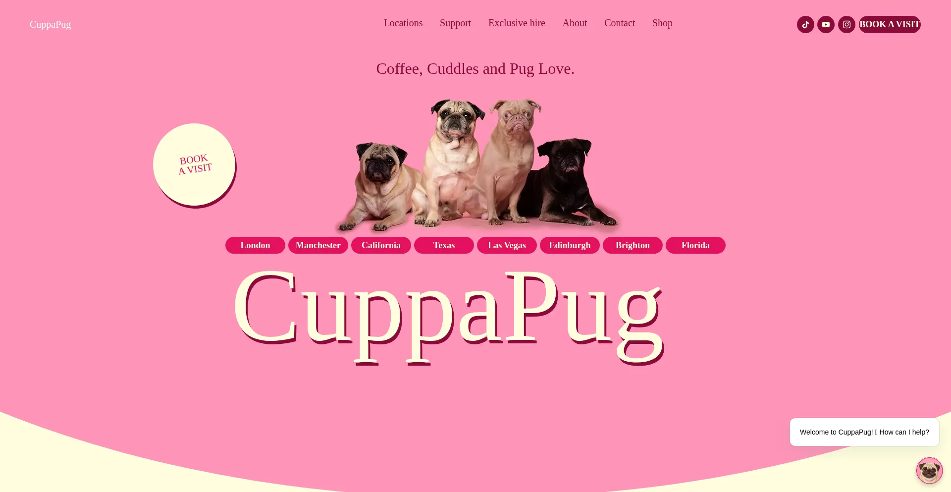 CuppaPug is a pug café with locations in London, Manchester and California, with upcoming spots in Texas and Las Vegas Come and get you coffee, cuddles and pug love.