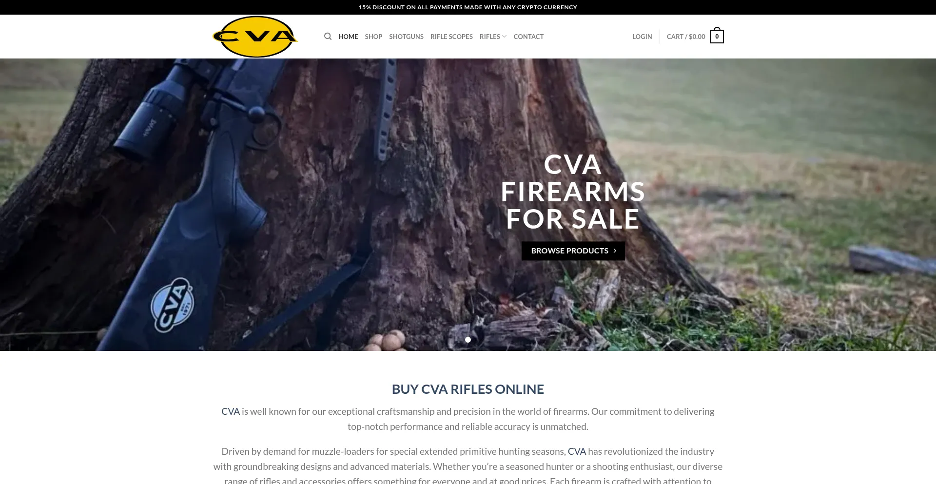 Analysis indicates that cvafirearmsusa.com operates as an e-commerce platform facilitating online transactions for goods or services. The website implements shopping cart functionality, payment processing systems, and product catalog features typical of commercial retail operations.