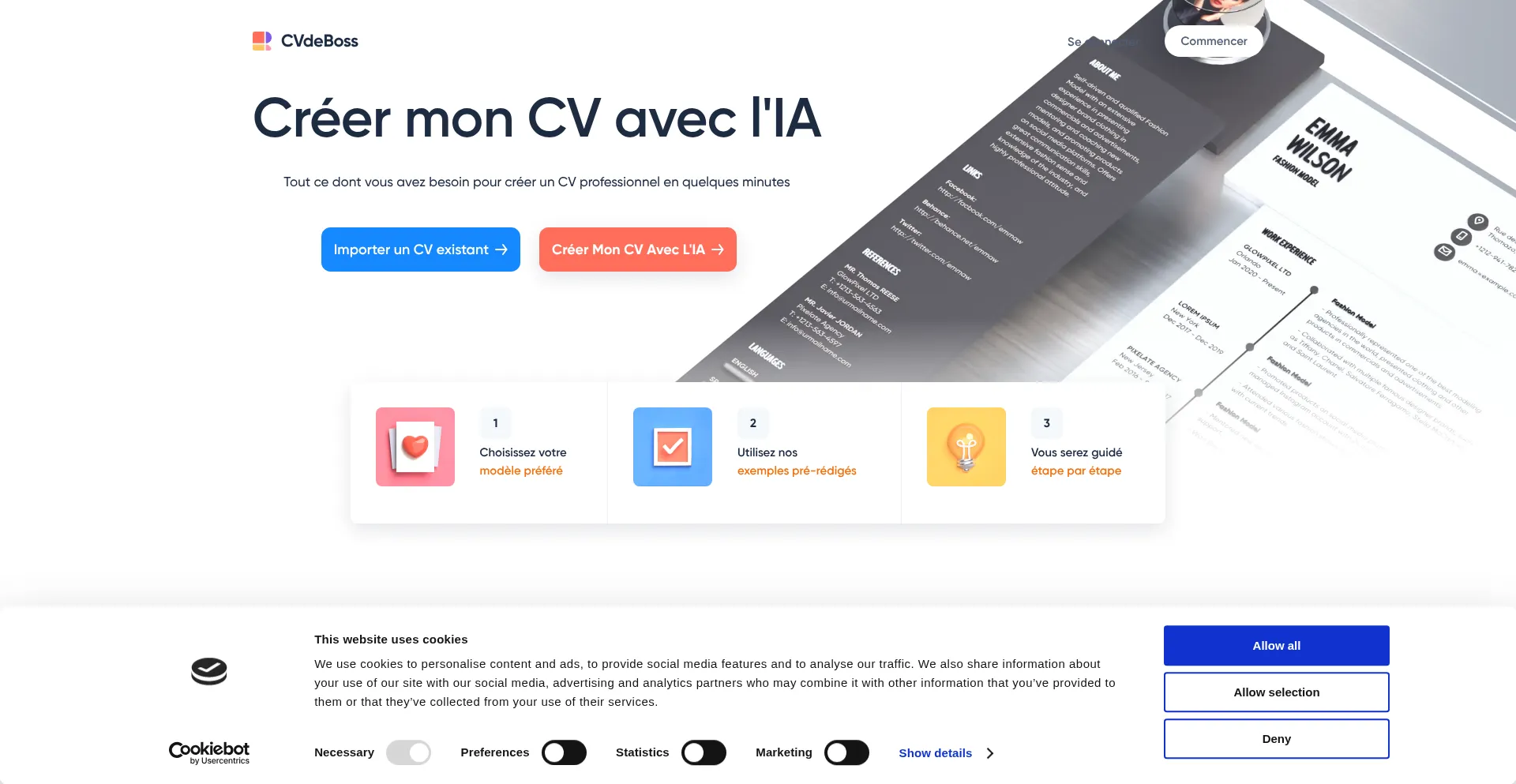 Créez un CV en ligne avec CVdeBoss. Des modèles de CV modernes et professionnels téléchargeables en PDF et DOCX.
