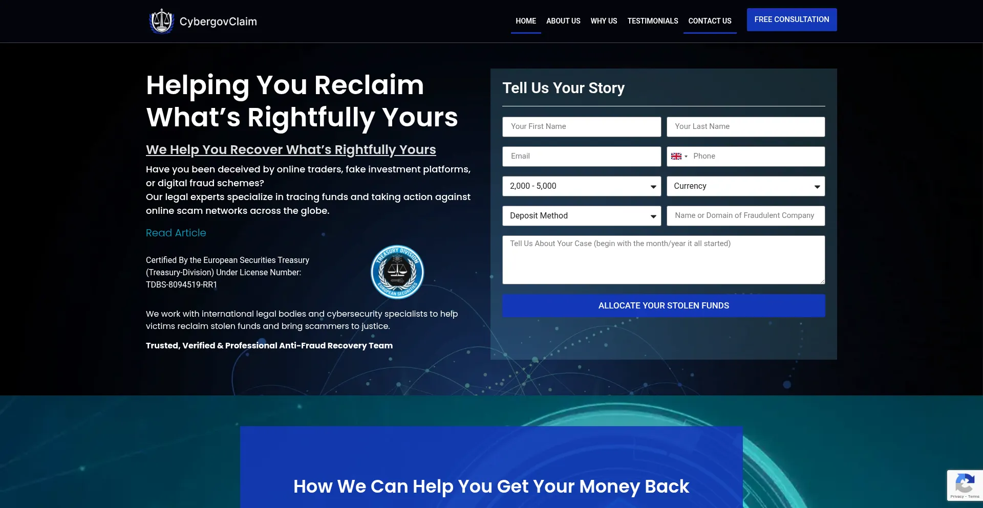 The website cybergovclaim.com advertises fund recovery services for lost or stolen assets. While some operate on contingency fee structures, others may require upfront payments, which can indicate fraudulent operations. Verify credentials and regulatory compliance before engaging such services.