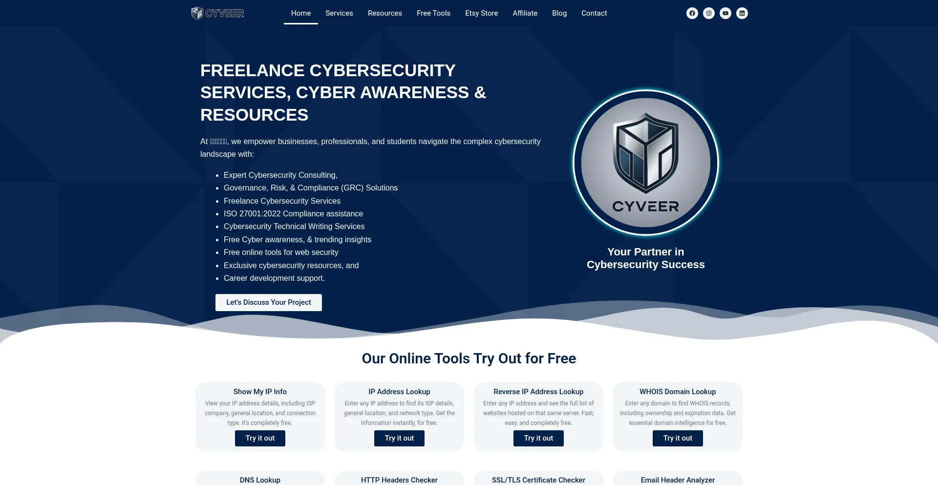 At 𝗖𝗬𝗩𝗘𝗘𝗥, we offer Freelance Cybersecurity Services, Expert Consulting, ISO 27001 Documentation, ISMS & GRC Compliance solutions, Free online Web Security too...