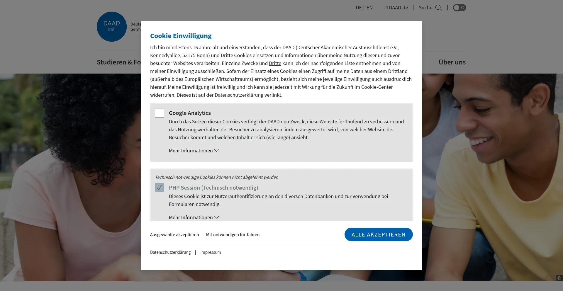 The website implements cookie consent mechanisms in compliance with privacy regulations such as GDPR or CCPA. This demonstrates that daad-iraq.org adheres to data protection standards and provides users with control over personal data collection practices.