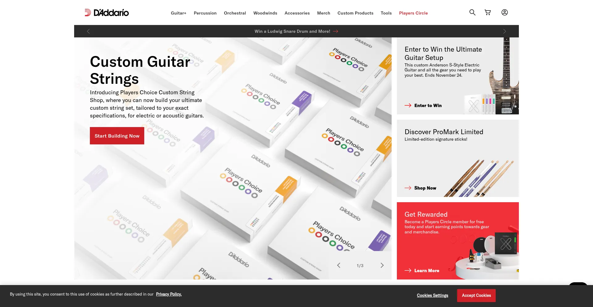 The website implements cookie consent mechanisms in compliance with privacy regulations such as GDPR or CCPA. This demonstrates that daddario.com adheres to data protection standards and provides users with control over personal data collection practices.