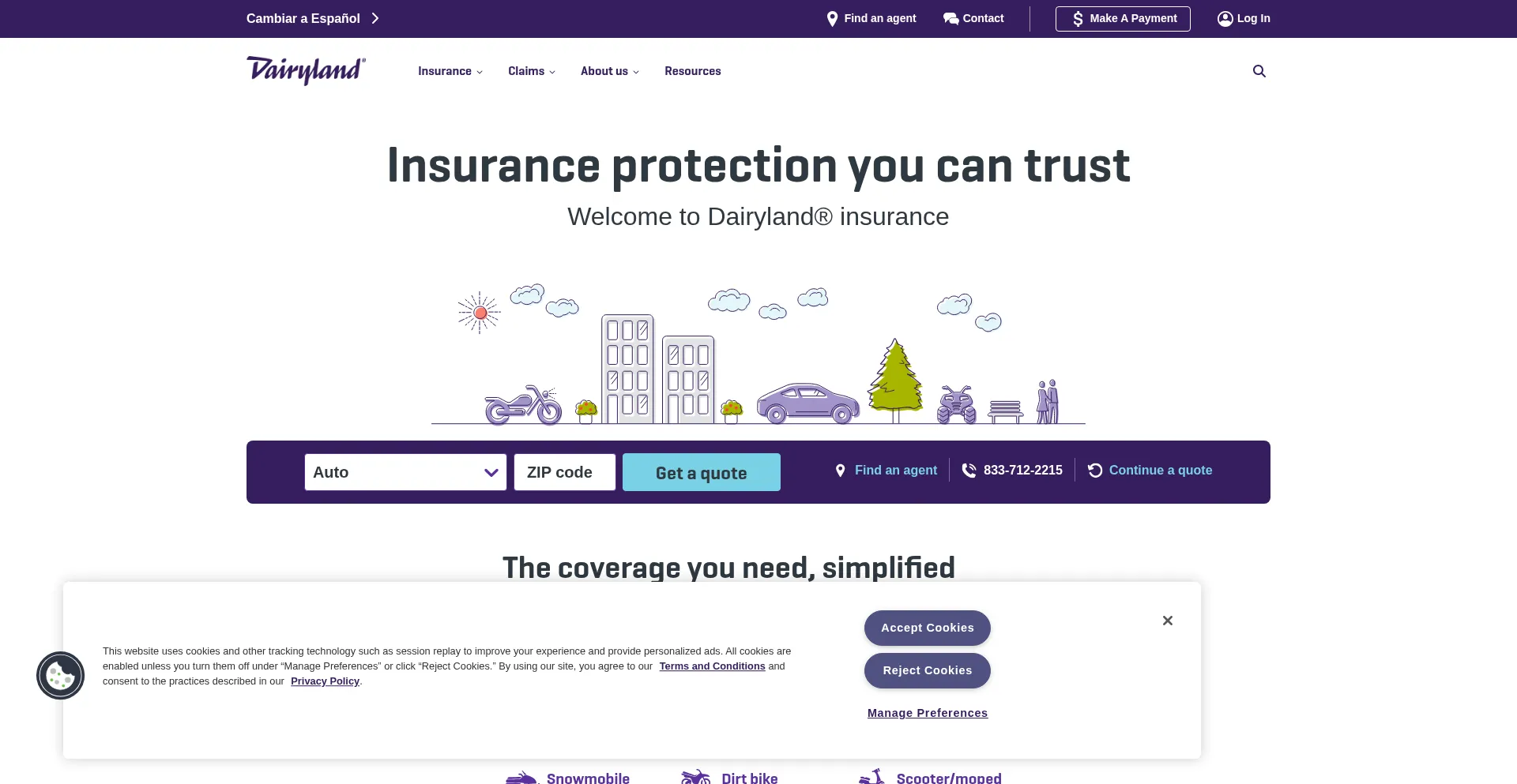 The website implements cookie consent mechanisms in compliance with privacy regulations such as GDPR or CCPA. This demonstrates that dairylandinsurance.com adheres to data protection standards and provides users with control over personal data collection practices.