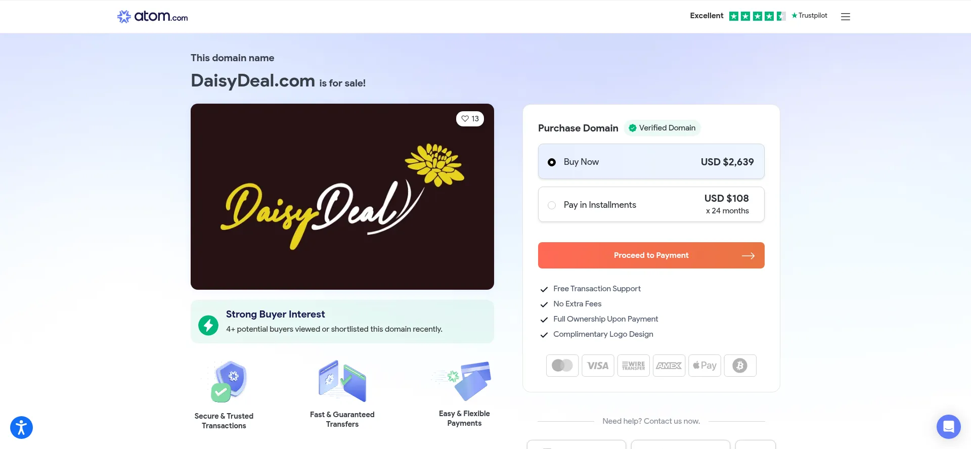 DaisyDeal.com is for sale at Atom. Buy this premium domain for $2,639USD and get a free logo. DaisyDeal.com has strong buyer interest, so act now!