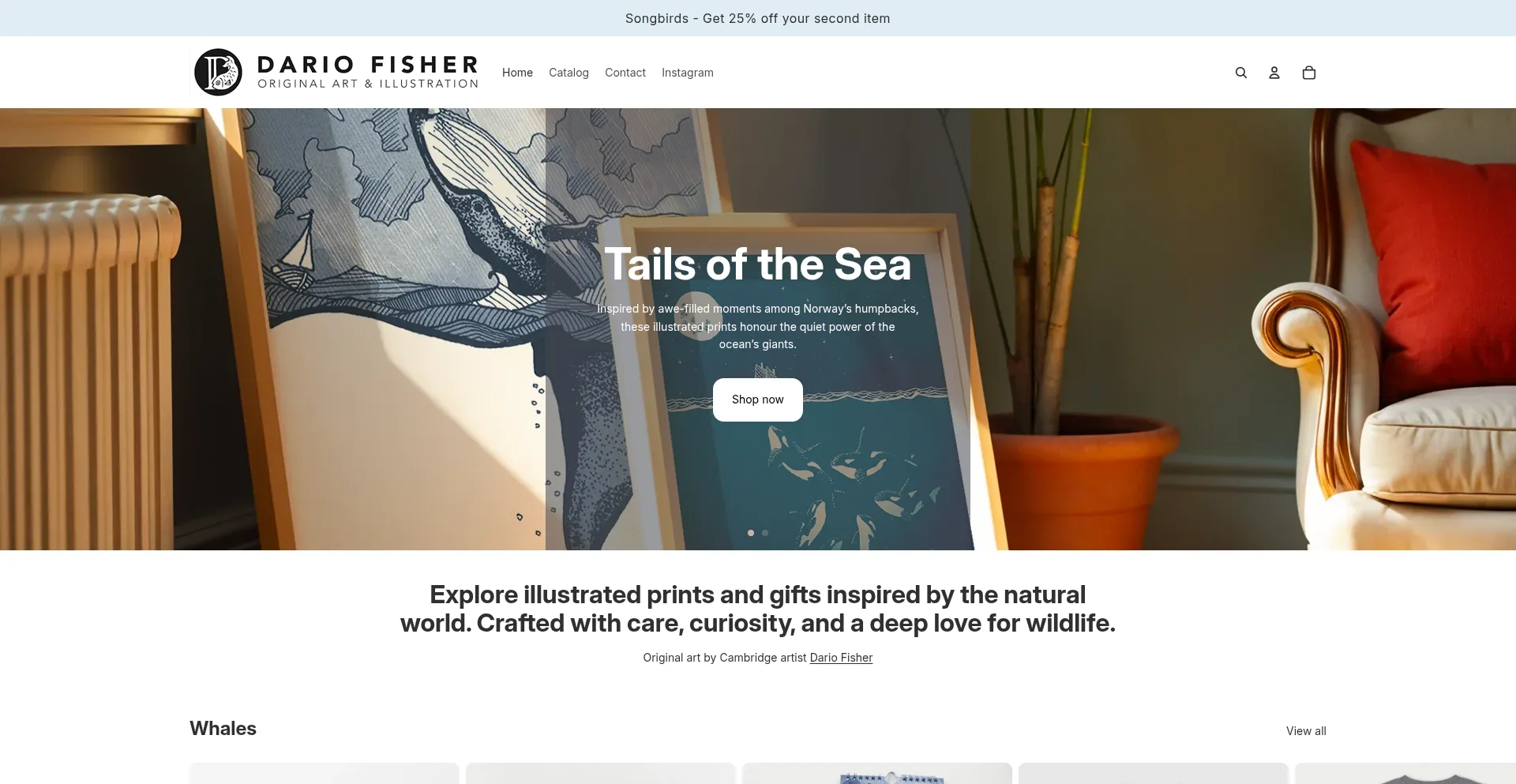 Nature, bird and whale prints, cards and gifts featuring illustrations by Cambridge artist Dario Fisher