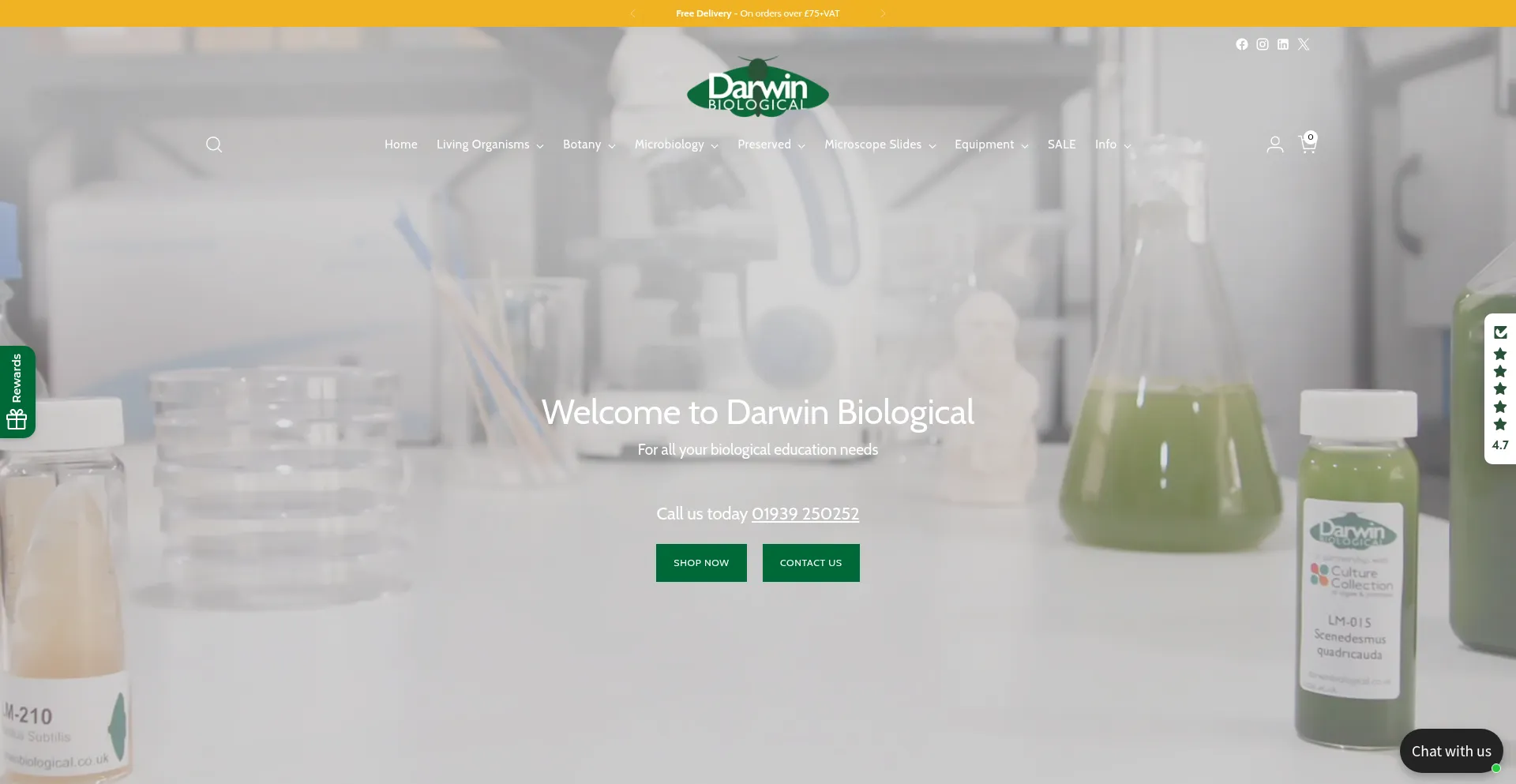 Darwin Biological supplies UK secondary school, college and university biology laboratories, with an extensive range of cultures, drosophila, algae, bacteria, preserved specimen...