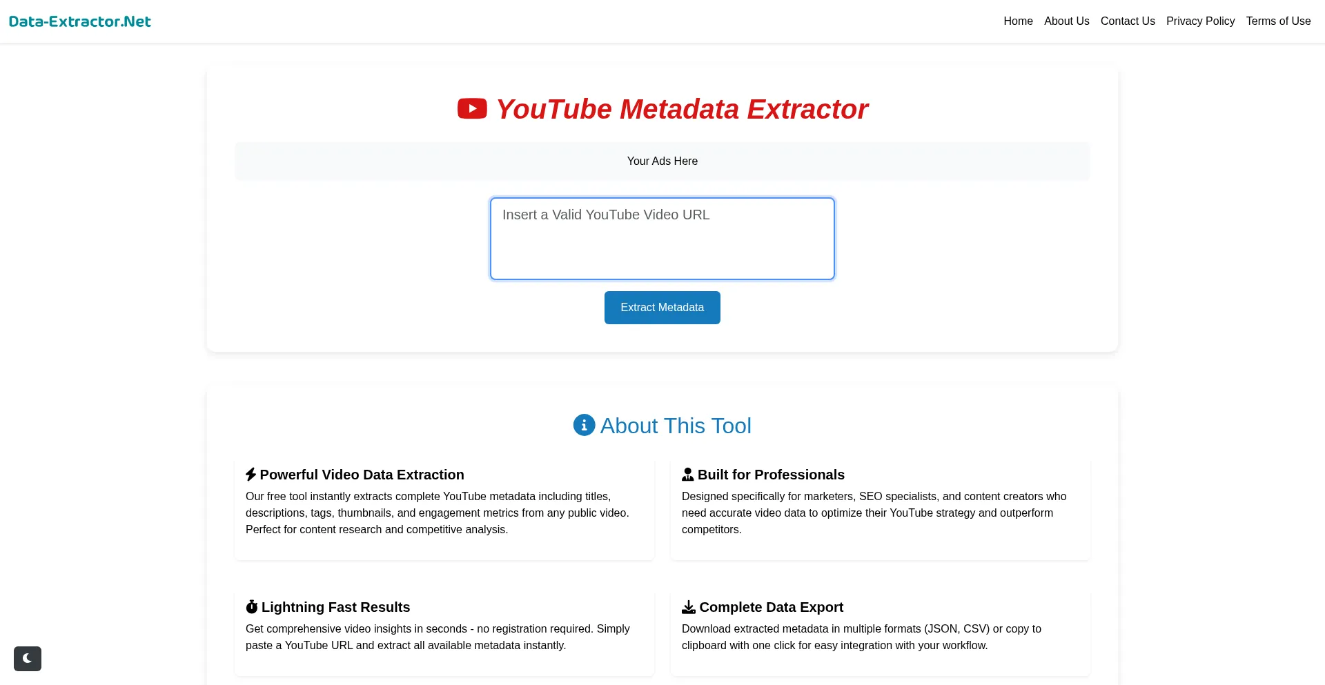 Extract YouTube Video Metadata Instantly! Our Professional Tool Fetches Titles, Tags, Descriptions & More for Better SEO & Analytics. Try it Now!