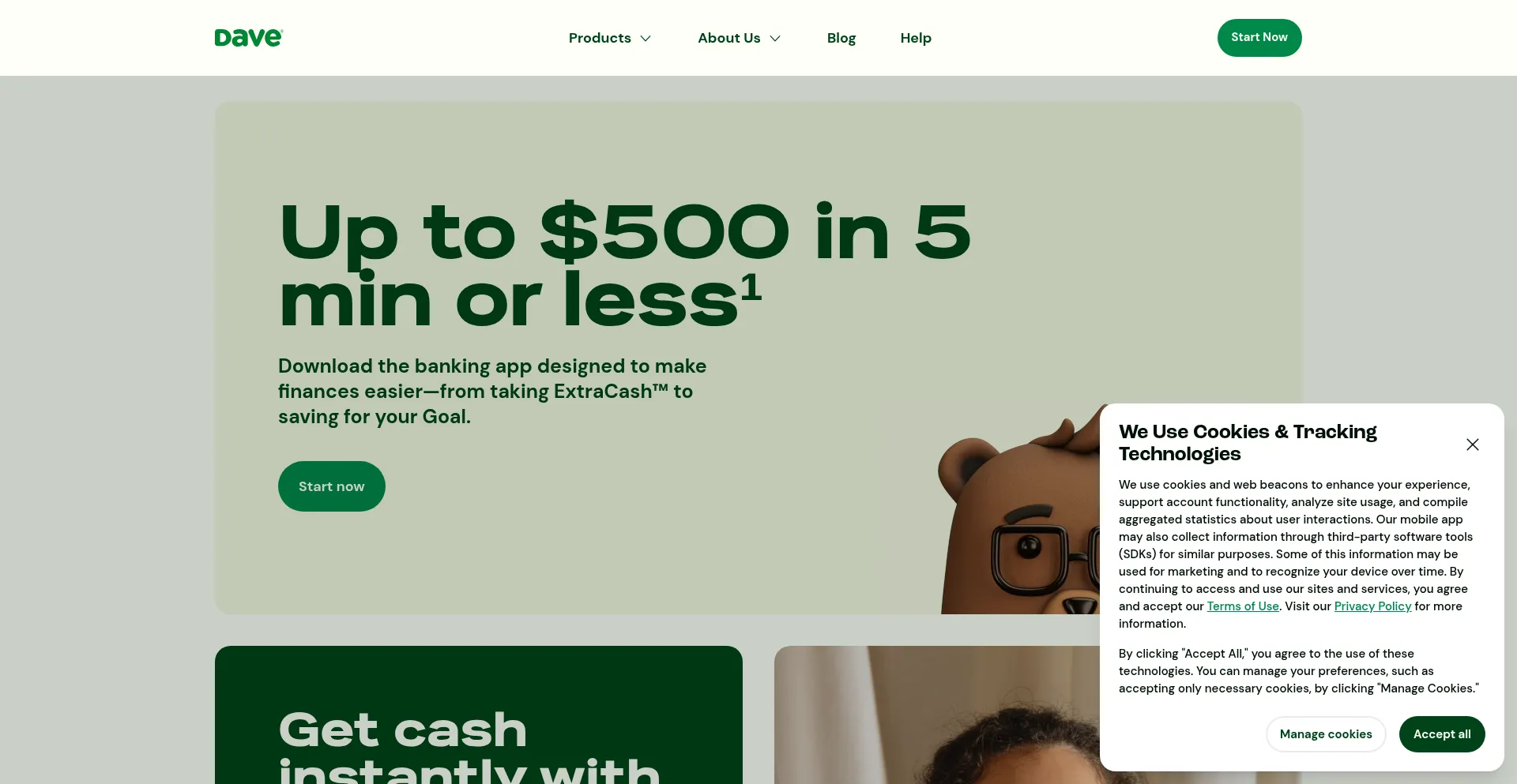 The website implements cookie consent mechanisms in compliance with privacy regulations such as GDPR or CCPA. This demonstrates that dave.com adheres to data protection standards and provides users with control over personal data collection practices.