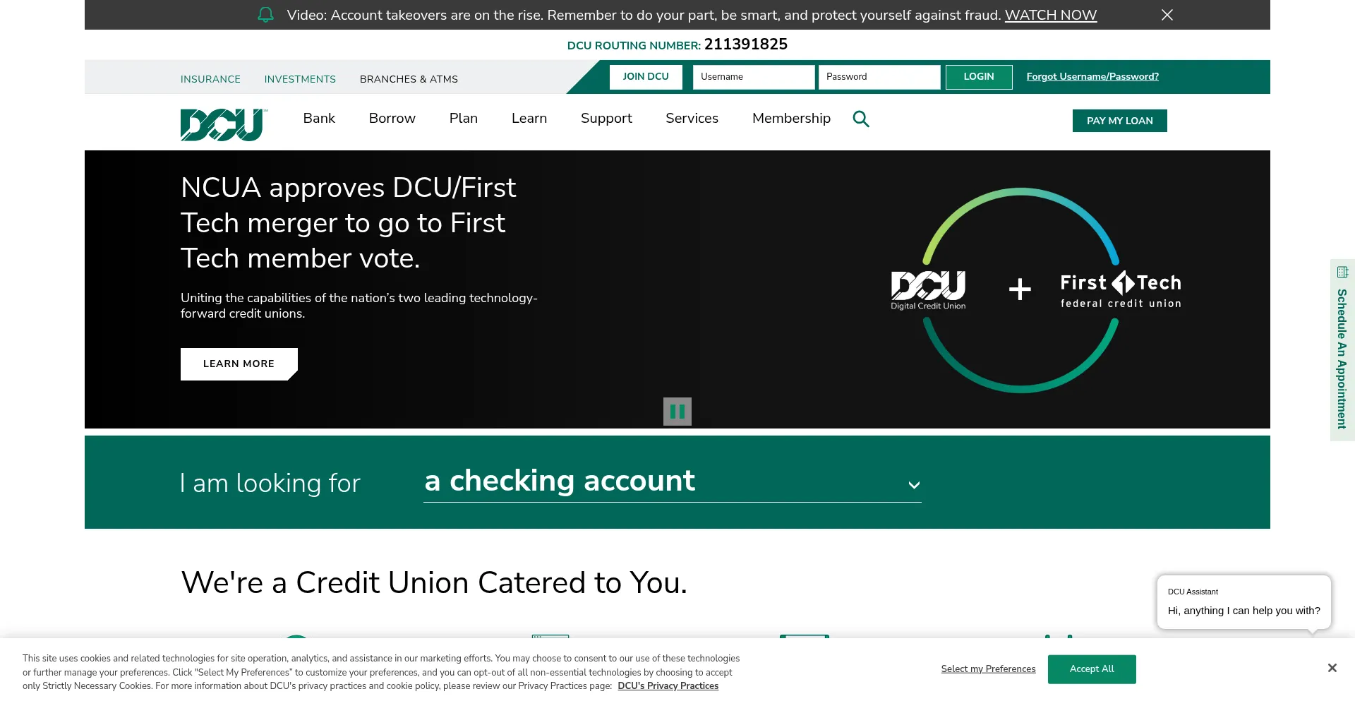The website implements cookie consent mechanisms in compliance with privacy regulations such as GDPR or CCPA. This demonstrates that dcu.org adheres to data protection standards and provides users with control over personal data collection practices.
