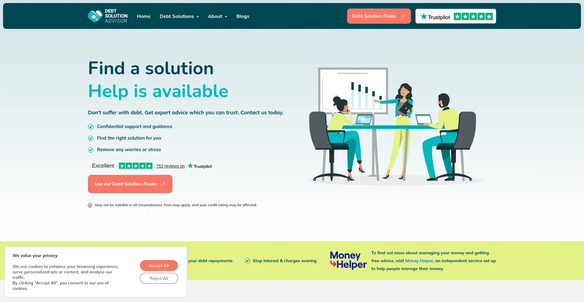 The website implements cookie consent mechanisms in compliance with privacy regulations such as GDPR or CCPA. This demonstrates that debtsolutionadvisor.co.uk adheres to data protection standards and provides users with control over personal data collection practices.