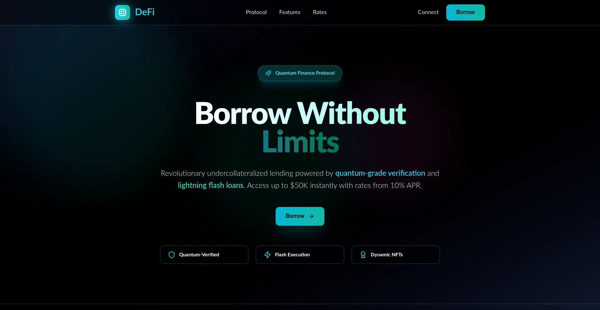 Revolutionary undercollateralized lending powered by quantum-grade verification and lightning flash loans. Access up to $50K instantly with rates from 10% APR. Zero-knowledge pr...