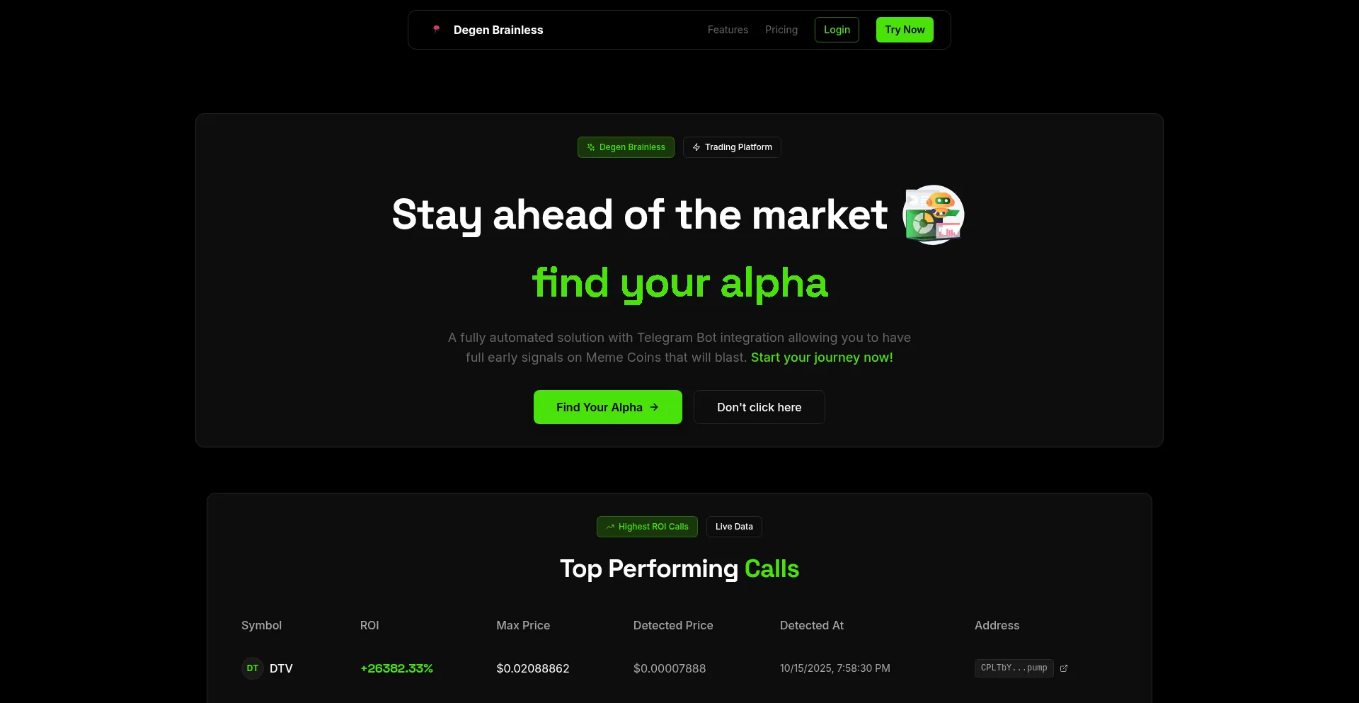 Degen Brainless - Advanced crypto trading platform for analyzing smart wallets and discovering tokens before they pump