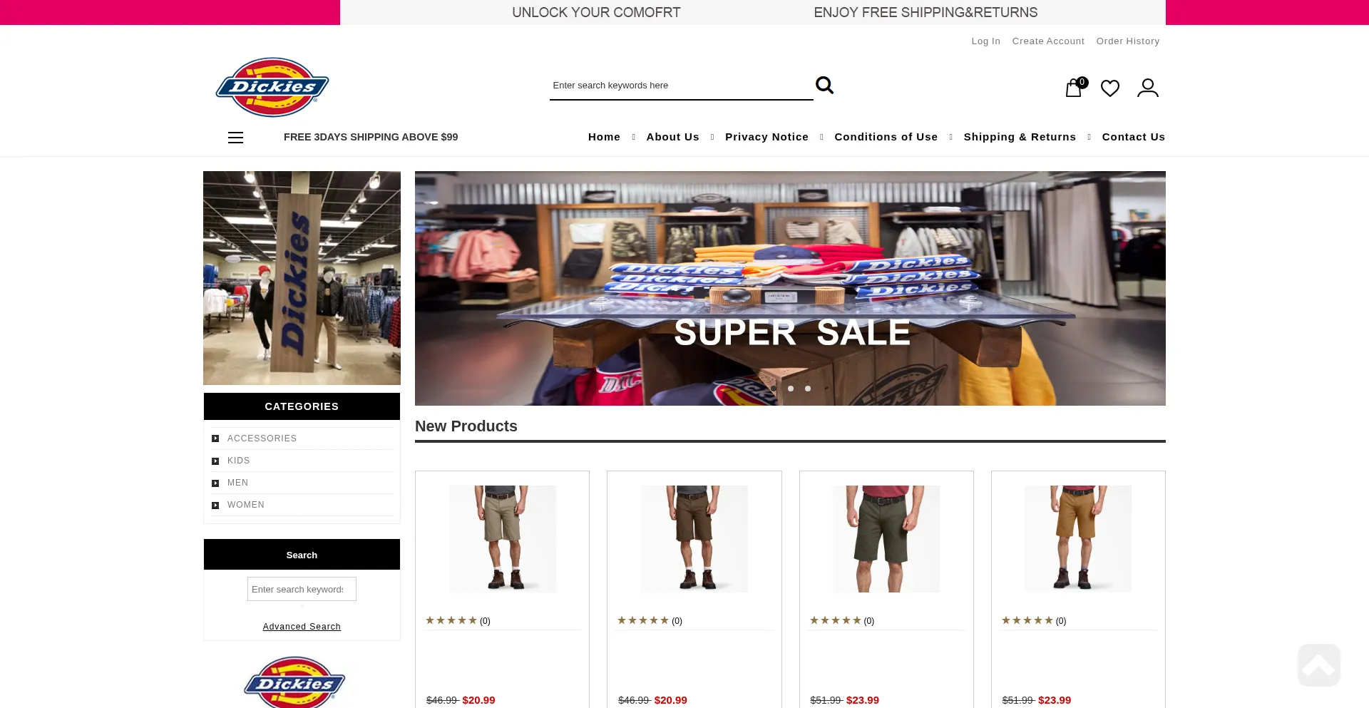Analysis indicates that dickies--pants.com operates as an e-commerce platform facilitating online transactions for goods or services. The website implements shopping cart functionality, payment processing systems, and product catalog features typical of commercial retail operations.