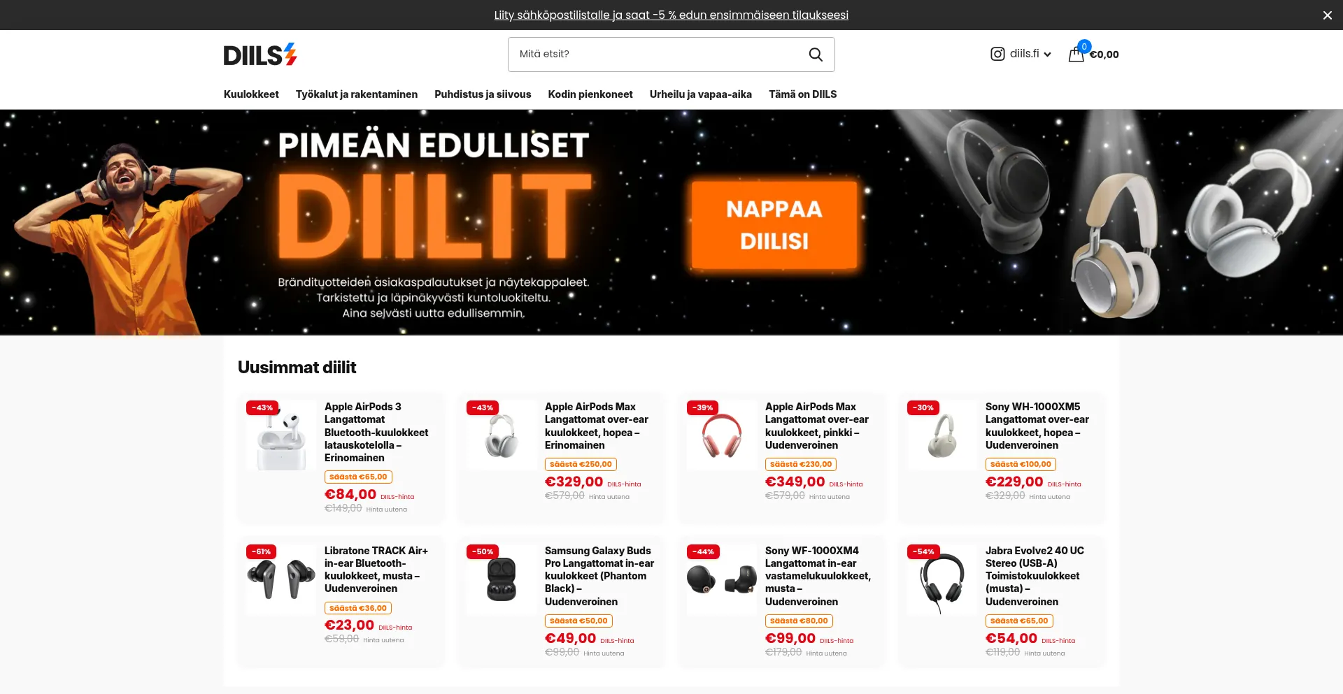 The website leverages popular product names and brands to attract traffic and generate user interest. These products may be offered through promotional campaigns or discount strategies designed to increase visitor engagement and conversion rates for diils.fi.