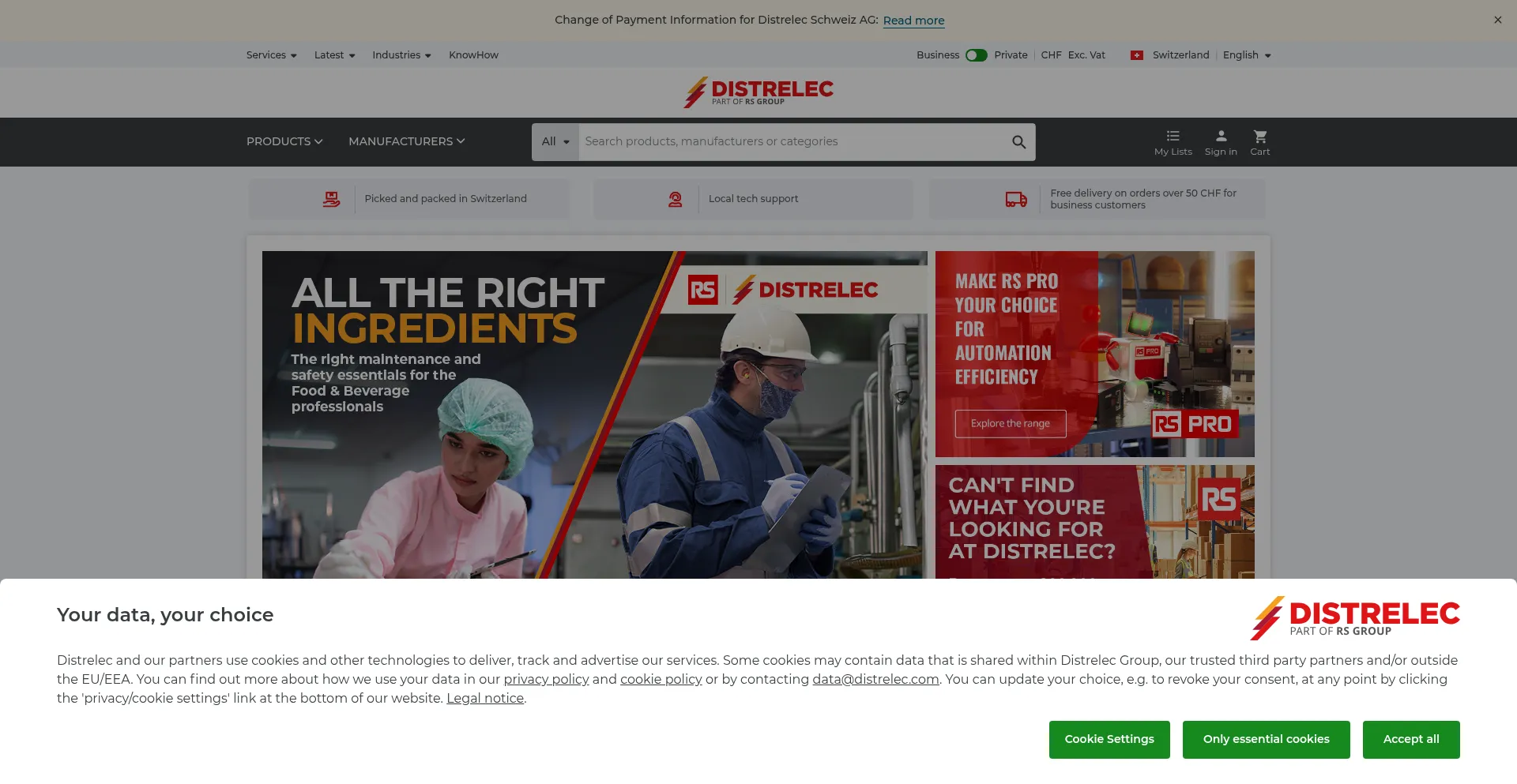 The website implements cookie consent mechanisms in compliance with privacy regulations such as GDPR or CCPA. This demonstrates that distrelec.ch adheres to data protection standards and provides users with control over personal data collection practices.