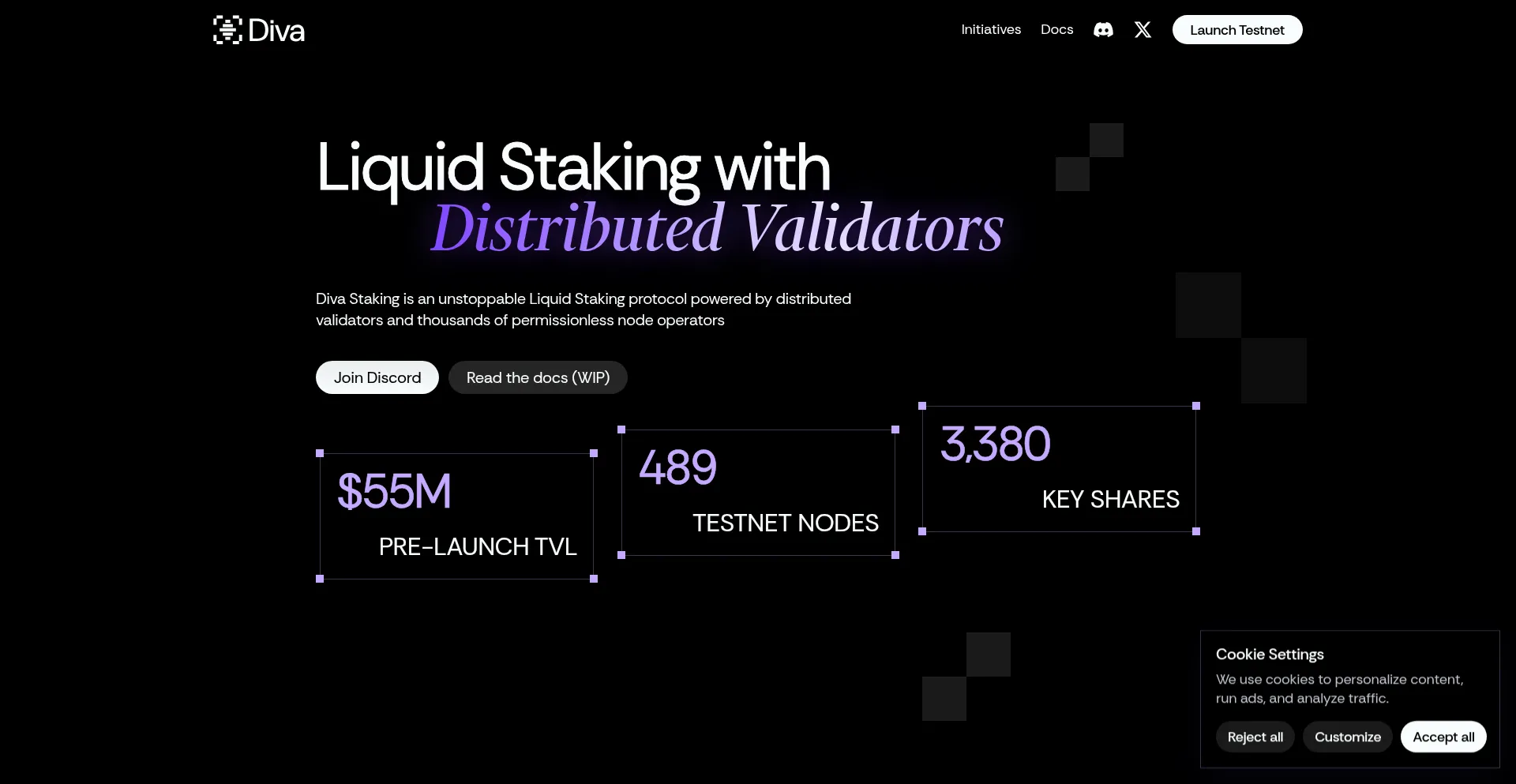 Diva Staking is an Ethereum Liquid Staking protocol powered by distributed validators and a set of permissionless node operators. Join our community and become part of Diva.