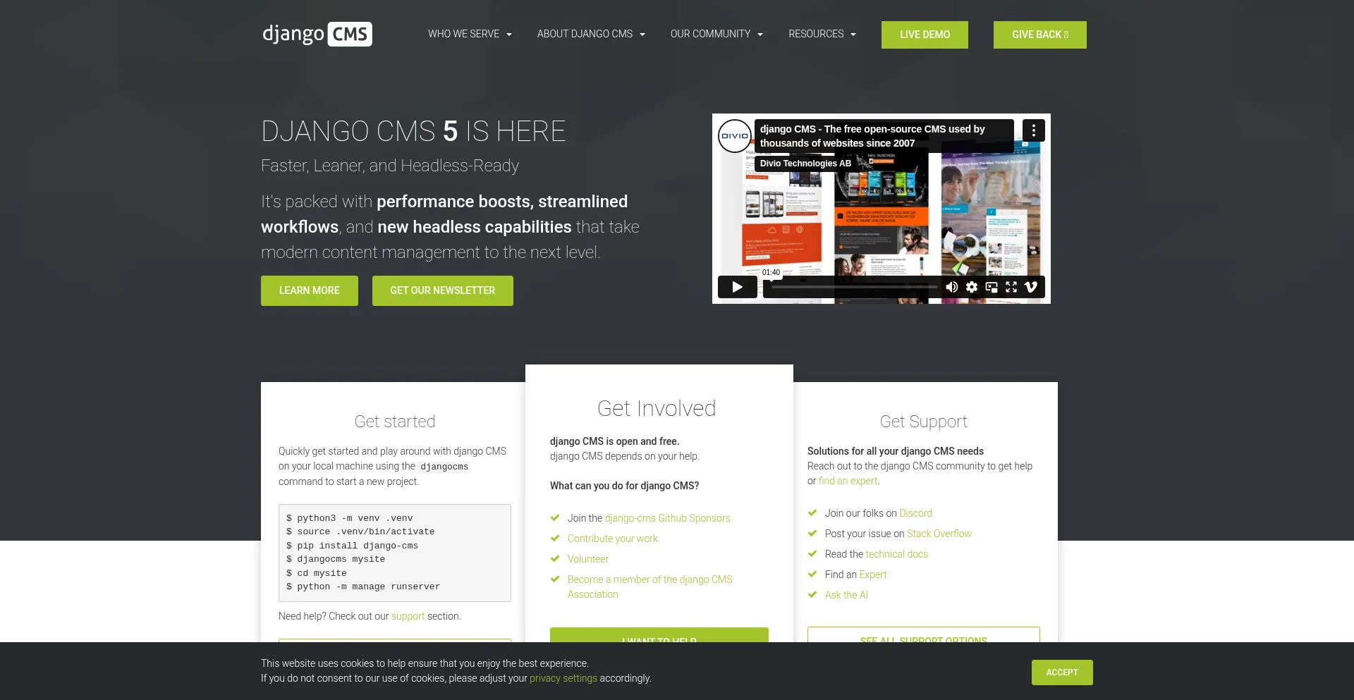 The website implements cookie consent mechanisms in compliance with privacy regulations such as GDPR or CCPA. This demonstrates that django-cms.org adheres to data protection standards and provides users with control over personal data collection practices.