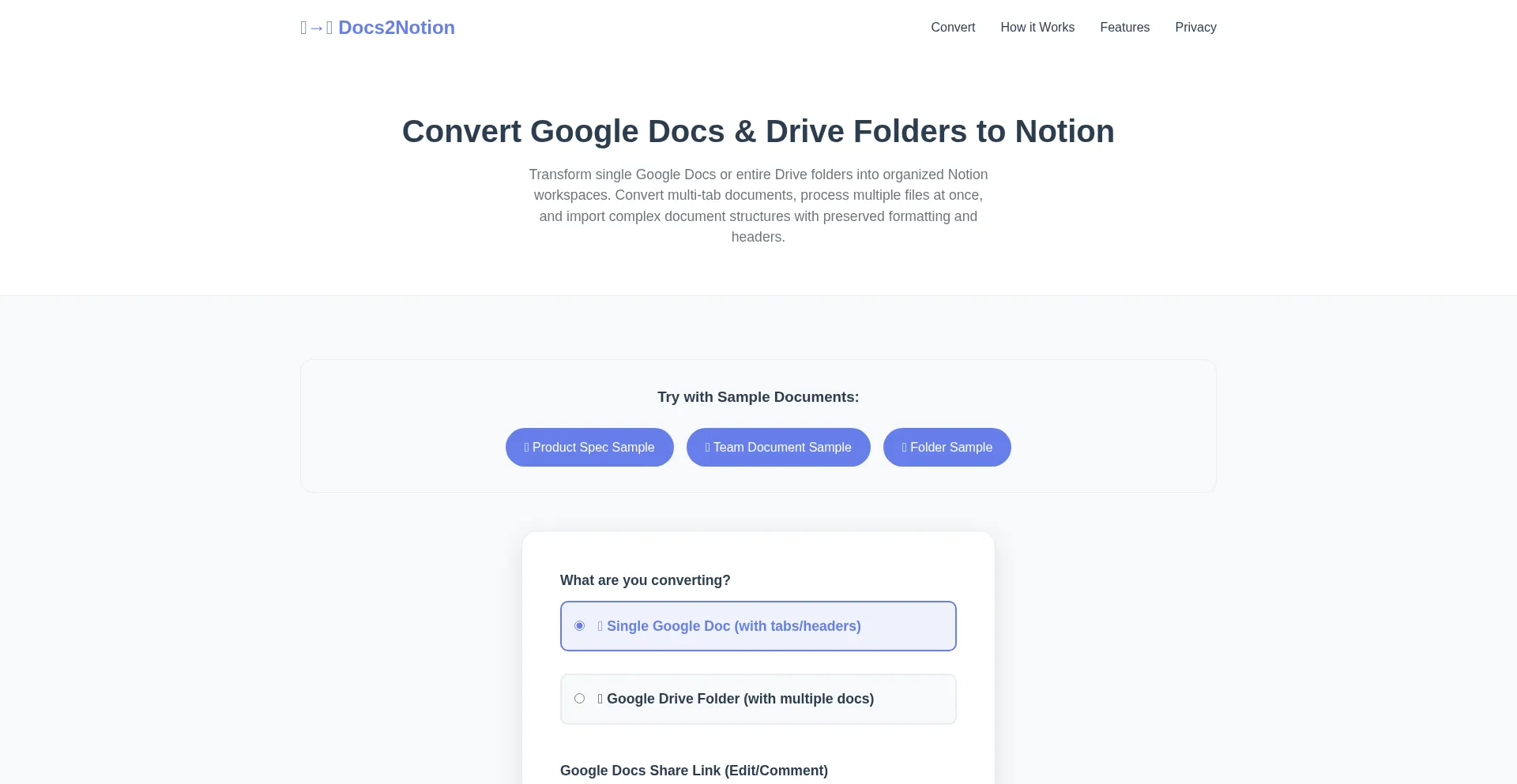 Import Google Drive folders and multi-tab Google Docs to Notion. Bulk convert multiple documents, preserve formatting, split by headers. Solve Notion's import limitations.