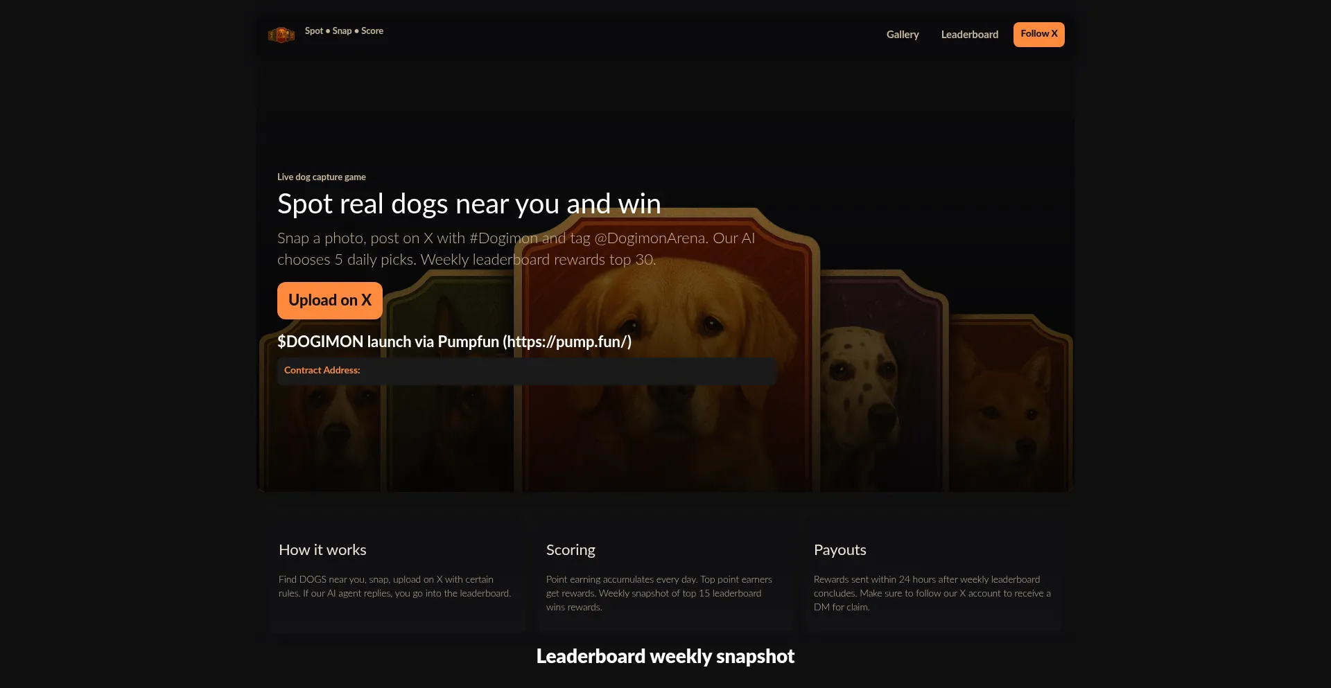 Find dogs near you, snap a photo, tag @Dogimon on X, and win points. Daily picks • Weekly leaderboard • Top 30 rewards