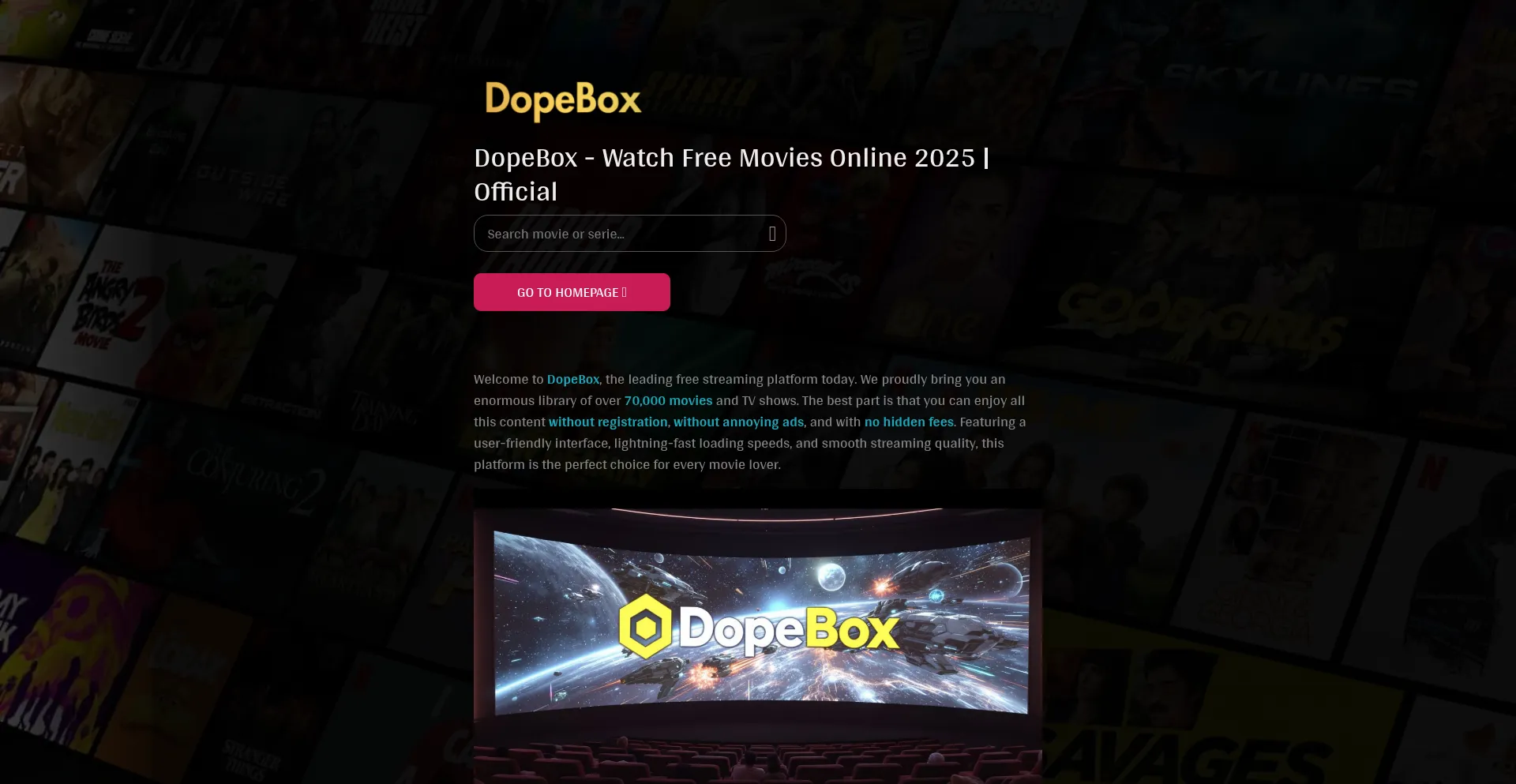 DopeBox is a free streaming platform that lets you watch over 70,000 movies and TV shows without ads or registration. Experience fast download speeds.