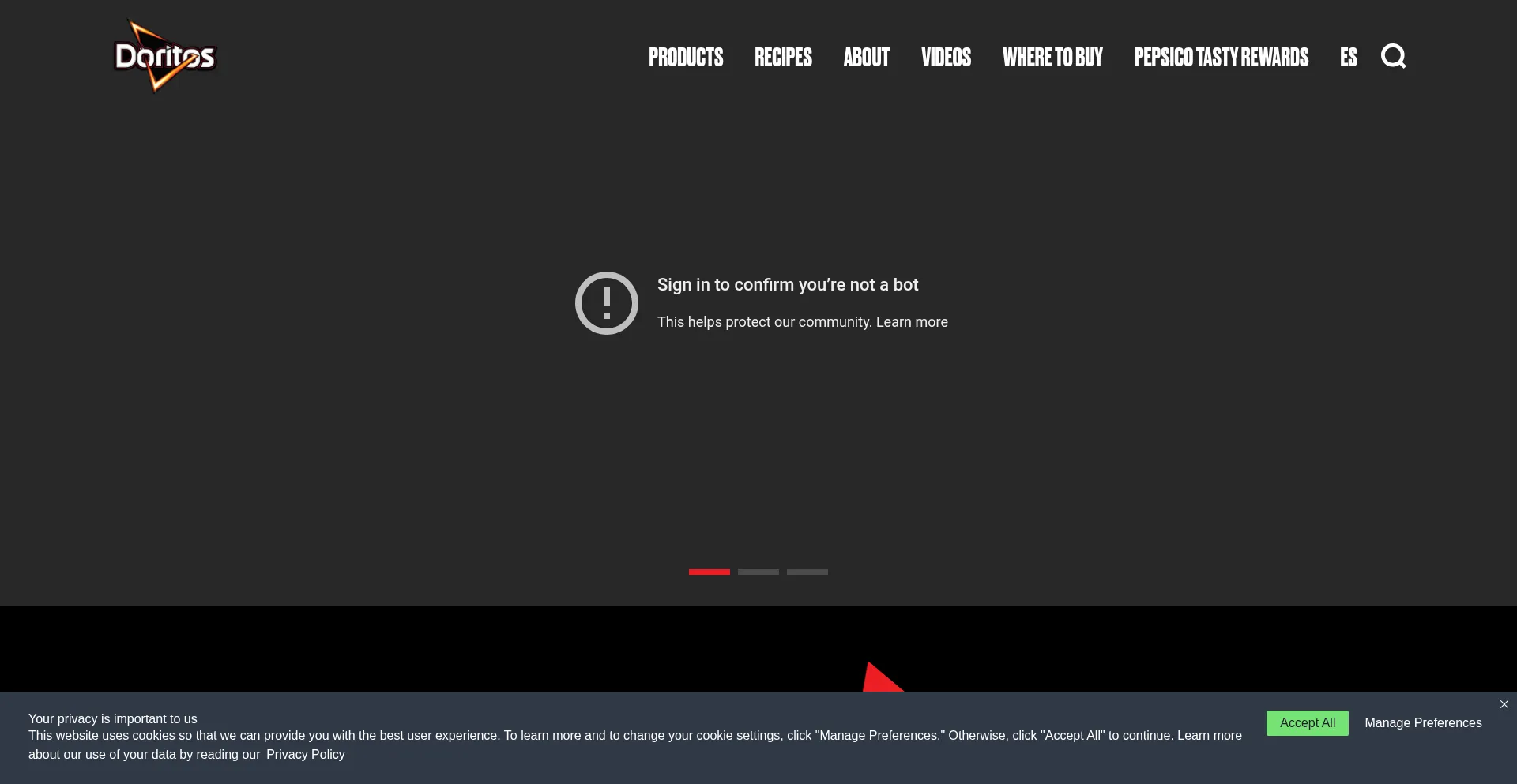 The website implements cookie consent mechanisms in compliance with privacy regulations such as GDPR or CCPA. This demonstrates that doritos.com adheres to data protection standards and provides users with control over personal data collection practices.