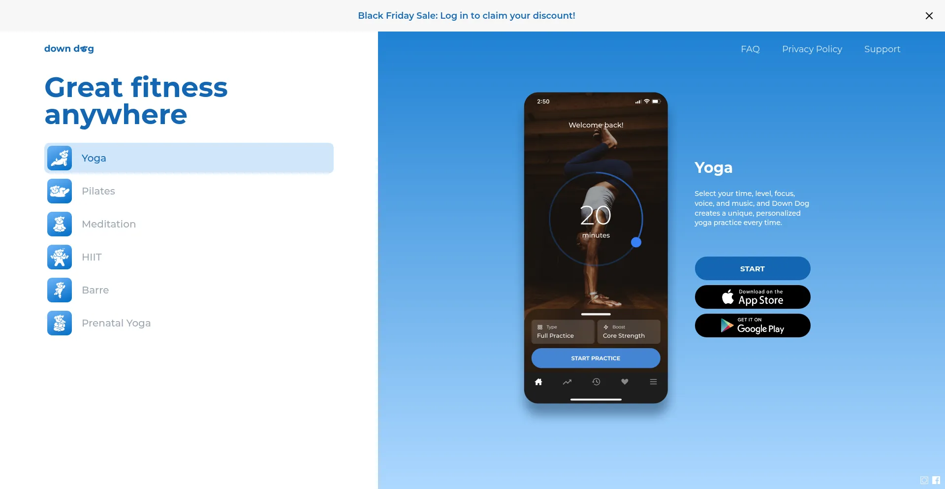 The downdogapp.com website offers a mobile application for Android devices, indicating expanded platform presence beyond web-based services.