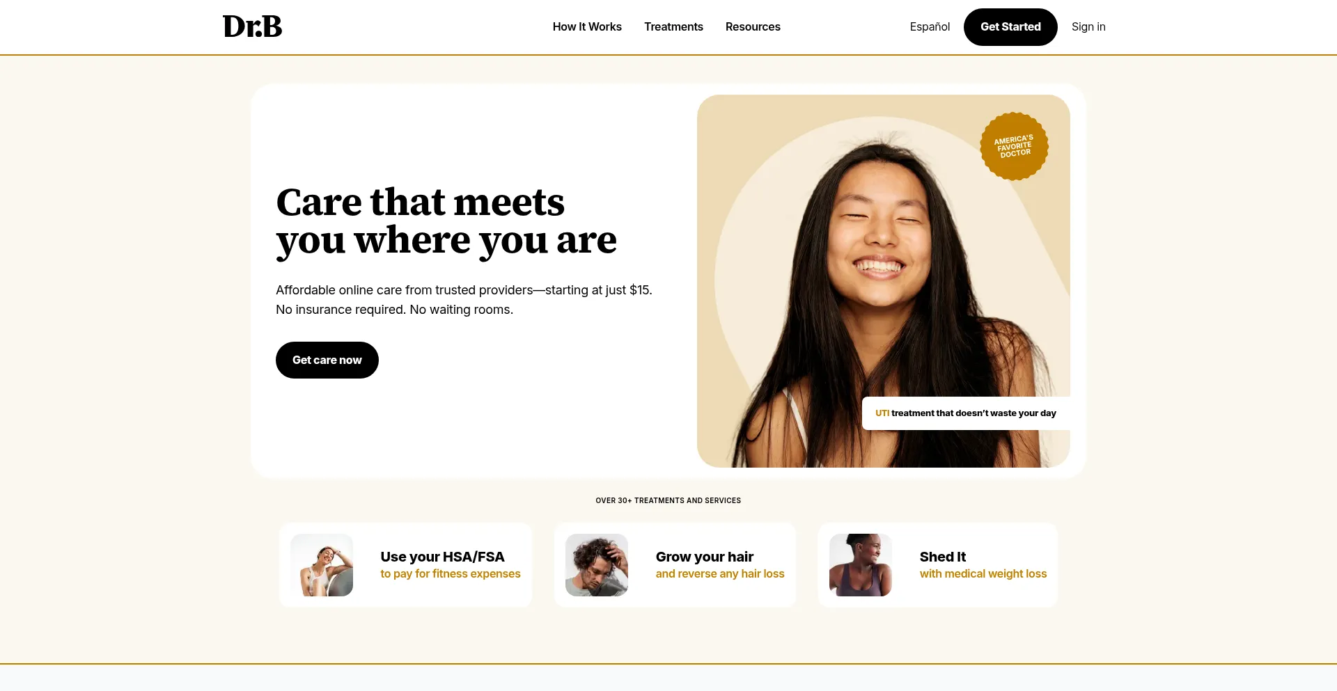 Dr. B offers $15 online consultations for common conditions, holistic longevity programs, HSA/FSA health savings, and No-Cost Care for qualifying patients.