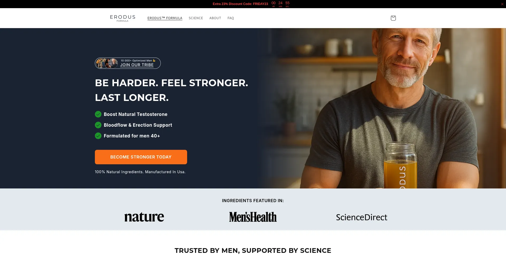 Discover ERODUS Formula For Men, the all-natural men's supplement designed for vitality, endurance, and confidence. Crafted with 19 premium ingredients to support energy, testos...