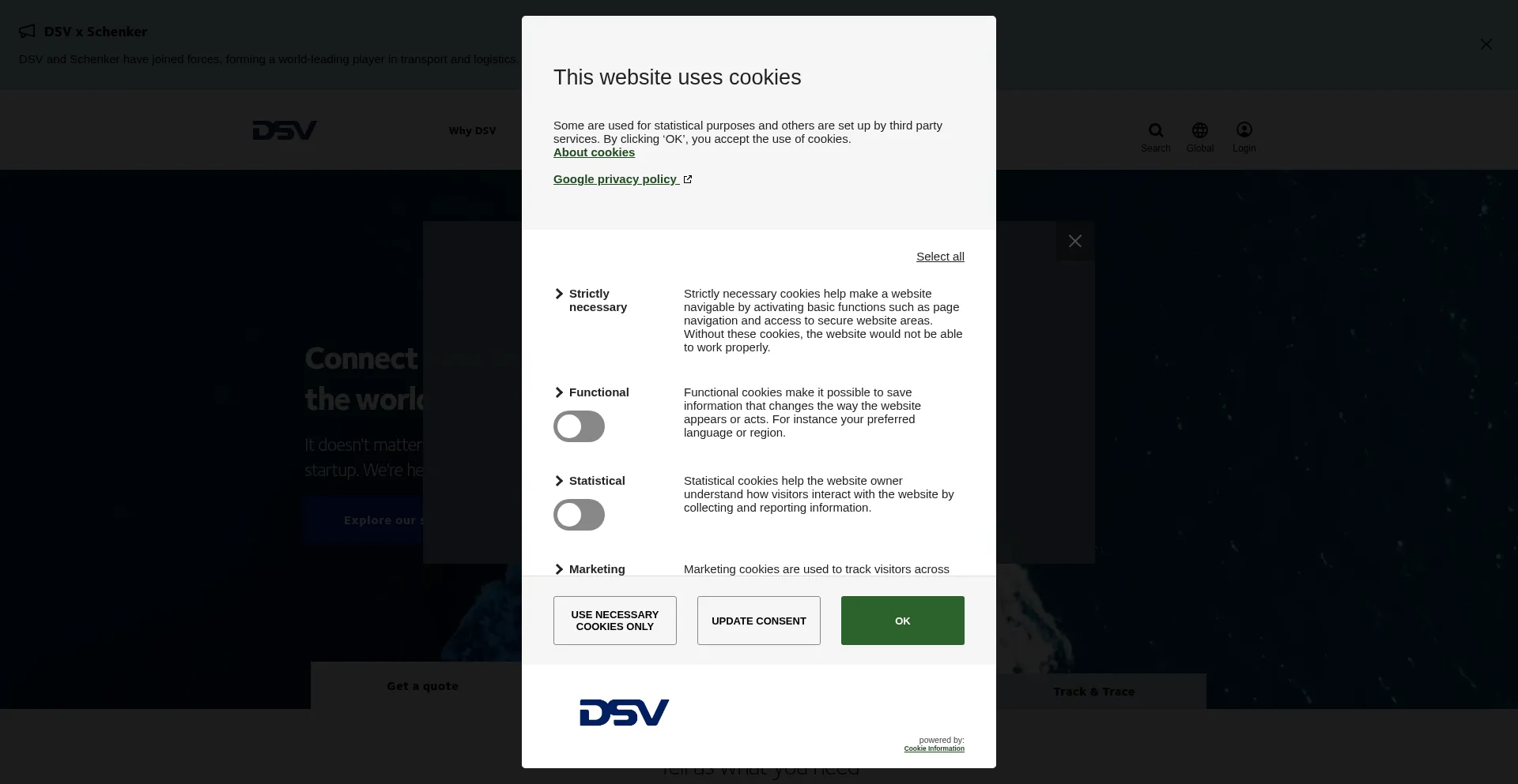 The website implements cookie consent mechanisms in compliance with privacy regulations such as GDPR or CCPA. This demonstrates that dsv.com adheres to data protection standards and provides users with control over personal data collection practices.