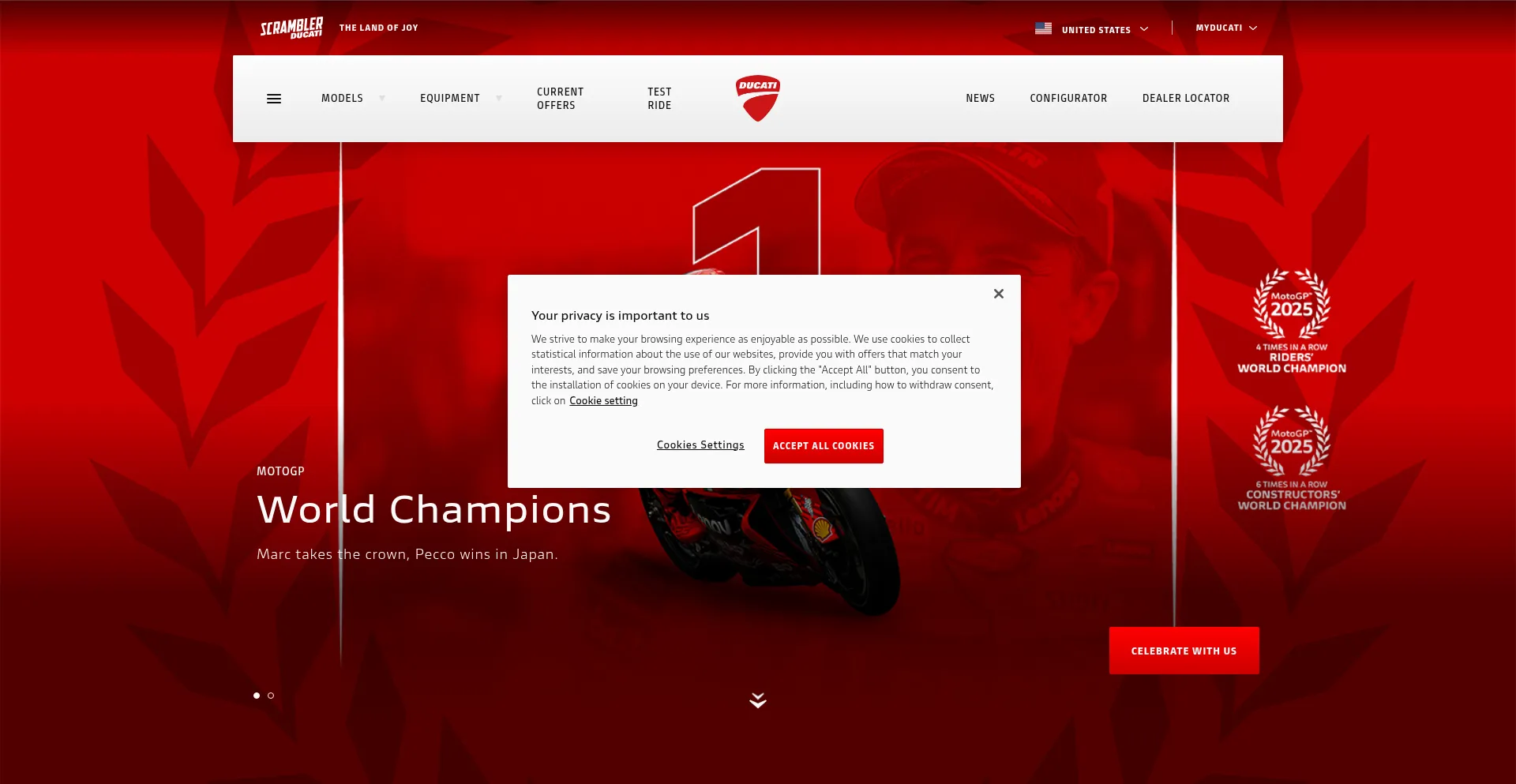 The website implements cookie consent mechanisms in compliance with privacy regulations such as GDPR or CCPA. This demonstrates that ducati.com adheres to data protection standards and provides users with control over personal data collection practices.